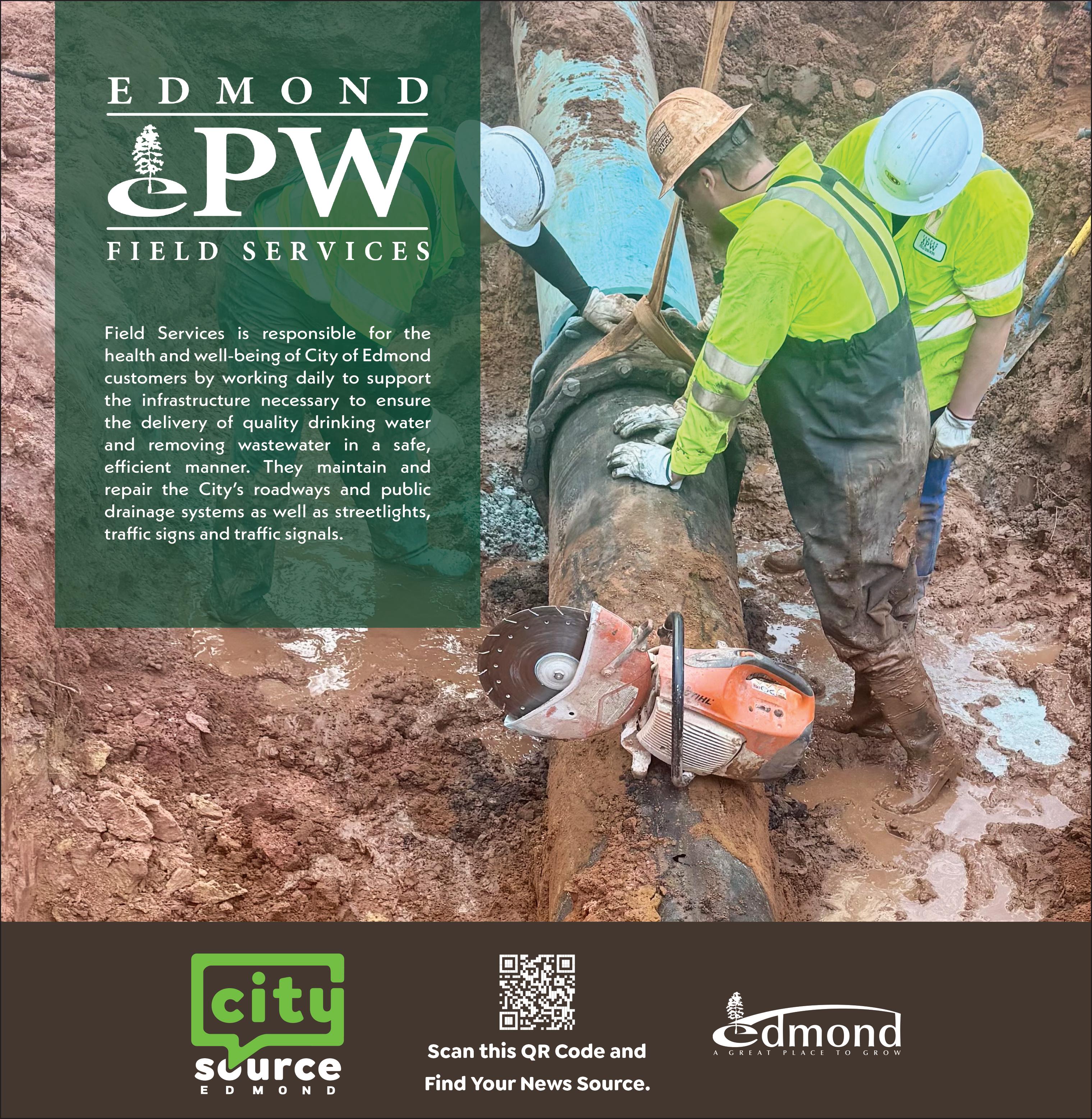 A division of Public Works, Field Services is responsible for the health and well-being of City of Edmond customers by working daily to support the infrastructure necessary to ensure the delivery of quality drinking water and removing wastewater in a safe, efficient manner. They maintain and repair the City’s roadways and public drainage systems as well as streetlights, traffic signs and traffic signals.