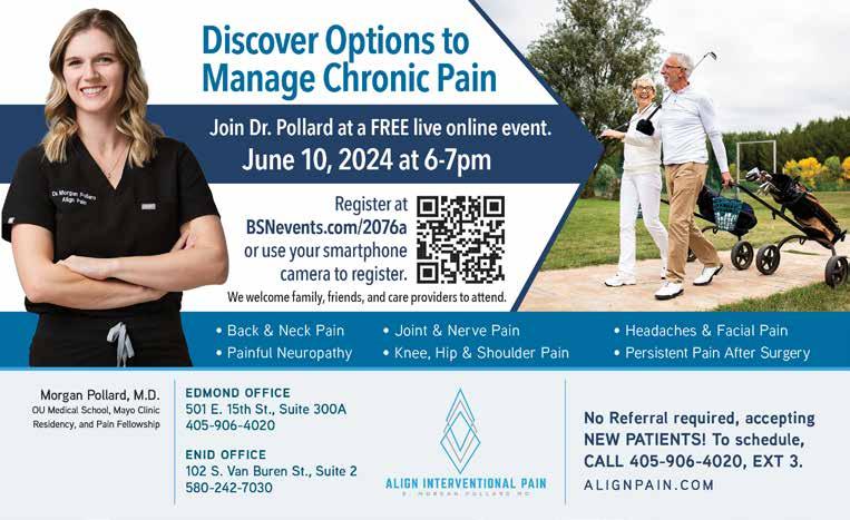 Align Interventional Pain is located at 501 E. 15th St., Ste 300 A, Edmond and online at alignpain.com. Contact Dr. Pollard at 405-906-4020.