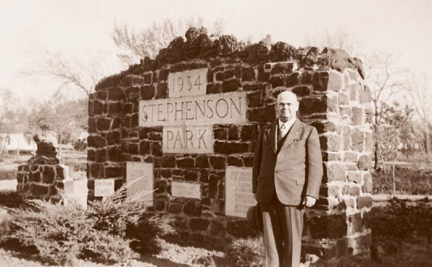 Fred M. Stephenson poses in front of the rock entrance to Stephenson Park in 1934. Established in 1892 as “South Park,” the park was renamed Stephenson Park in honor of City of Edmond manager, Fred M. Stephenson in 1934. The newly-refurbished Stephenson Park of the thirties included tennis and croquet courts, an elaborate rock garden in the ravine, and the planting of trees and shrubs.