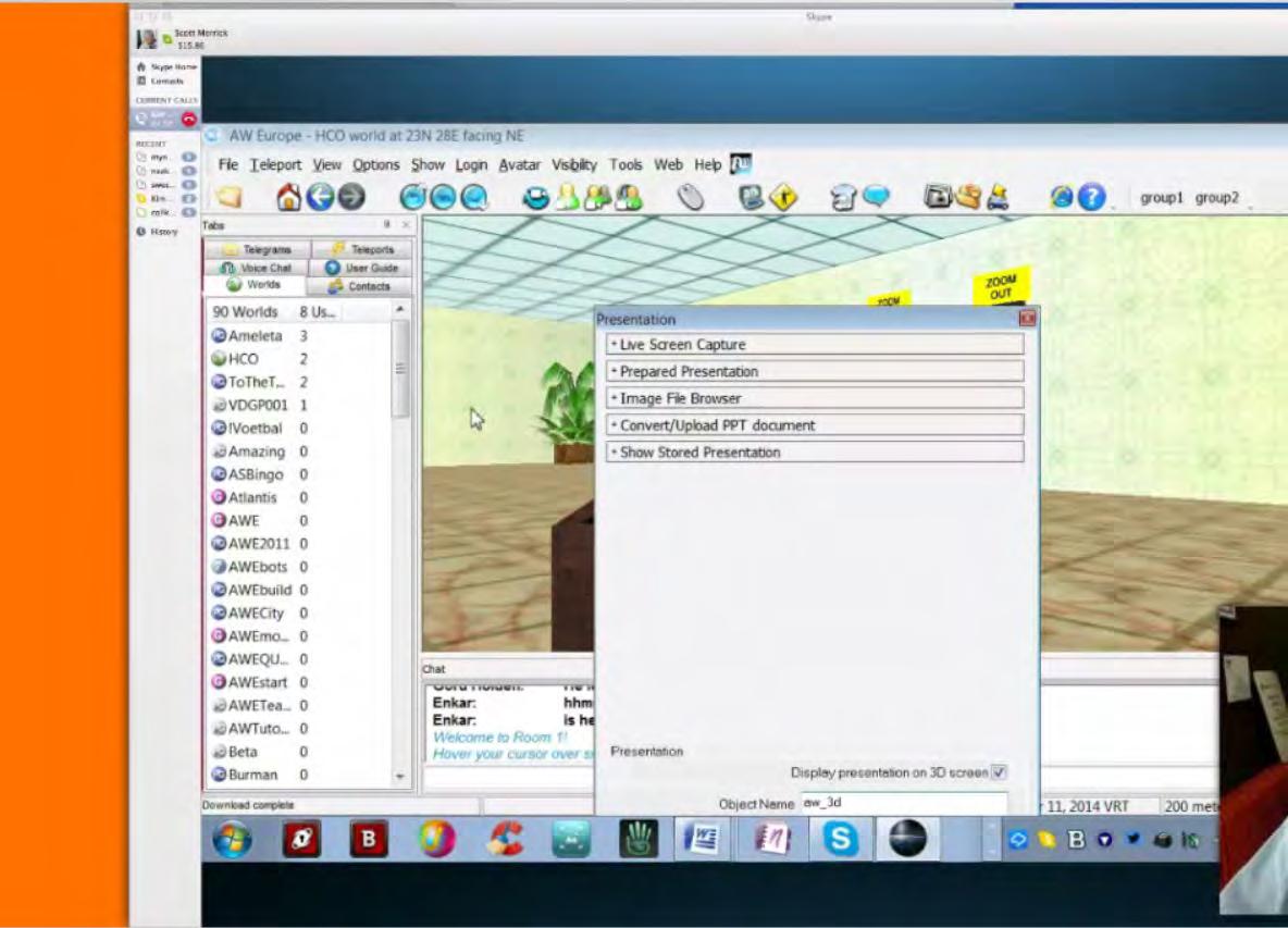 GH: I’m going to go up to the presentation tool and click. I can click on the live screen capture [button] and then click on any window open on my monitor. It’s now displayed inworld in the middle of the screen of each attendee.