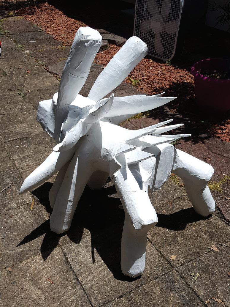 Pokémon Go is one of my current obsessions. (Over 1000 Ravelry projects come up for Pokémon!) So when I was considering a project for our regional Yard Art Day, I decided to make a Pokémon. Knitting wouldn’t work here – too hard to make something big enough to be seen in the yard. I had collected a bunch of plastic bottles and coffee cans that would make a good structure for papier-mâché. The various evolutions of Eevee are some of my favorite Pokémon, so I decided to make the electric type, Jolteon.