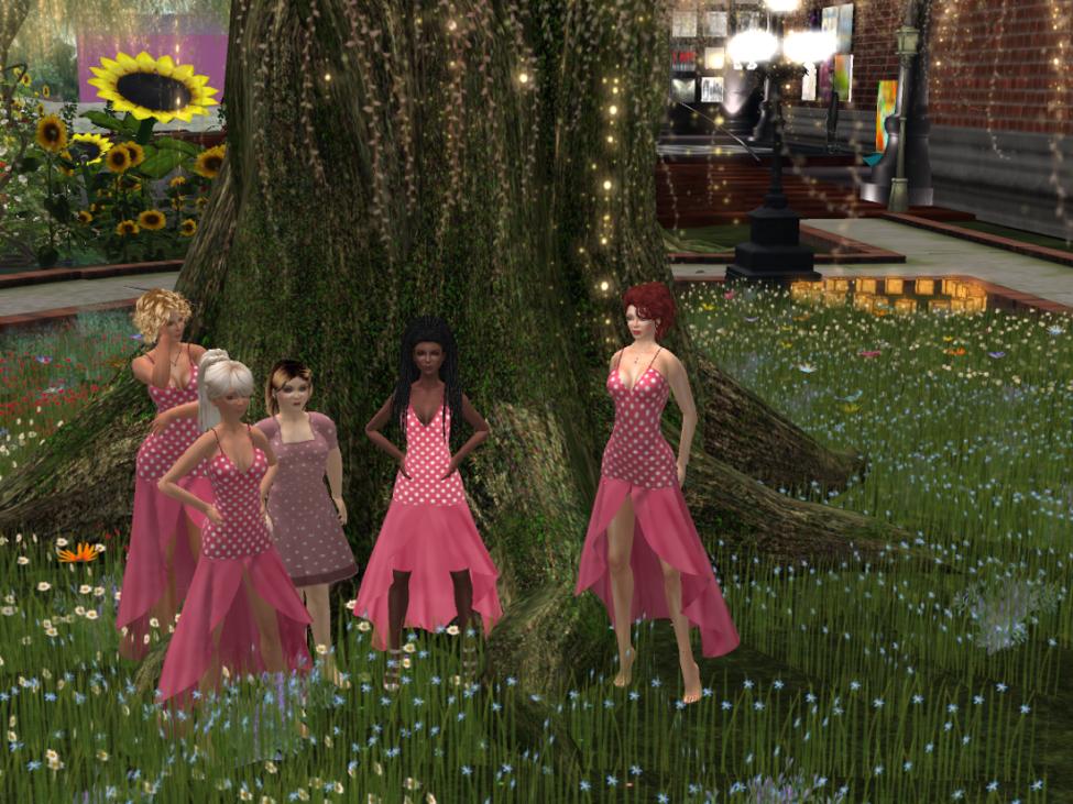 As it was getting late, we all went outside the Free Dove and posed under a tree in our pink lady outfits. Beth decided we should take a picture to show how much our style choices have changed since our first Rez Day in Second Life.