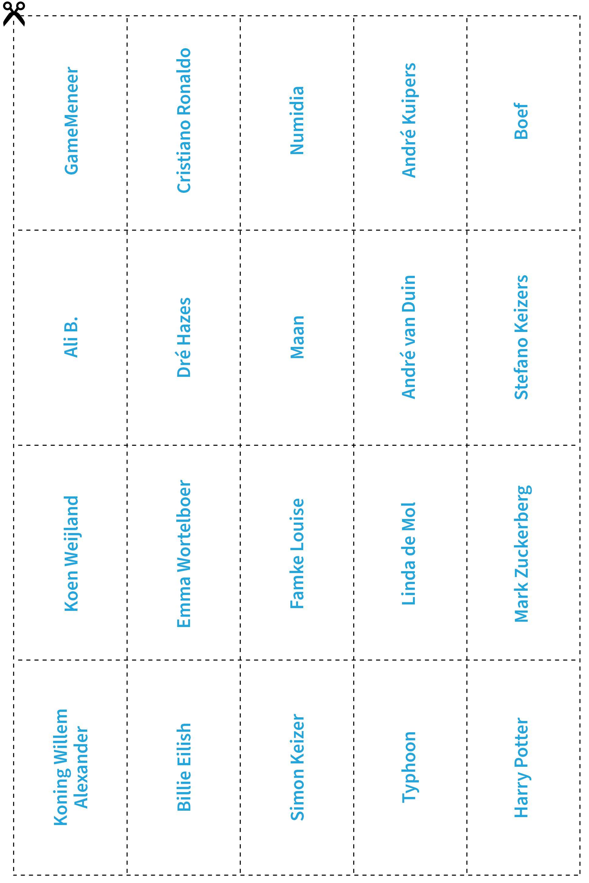 Ikplakdadelijkeenkaartjeopjerug.Opdatkaartjestaateennaamvaneenbekendepersoon.Jullie moetenradenwieeropjerugstaat.