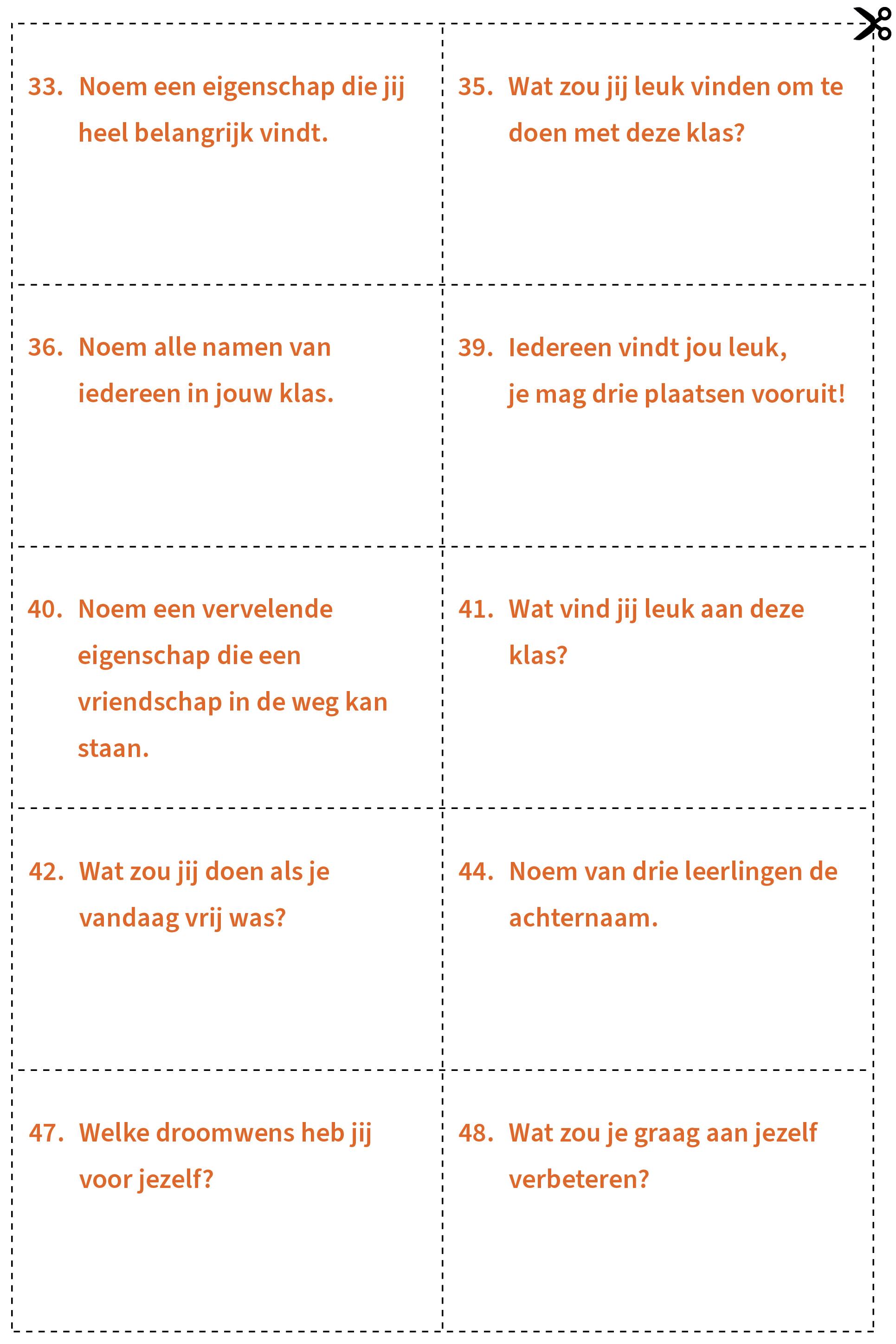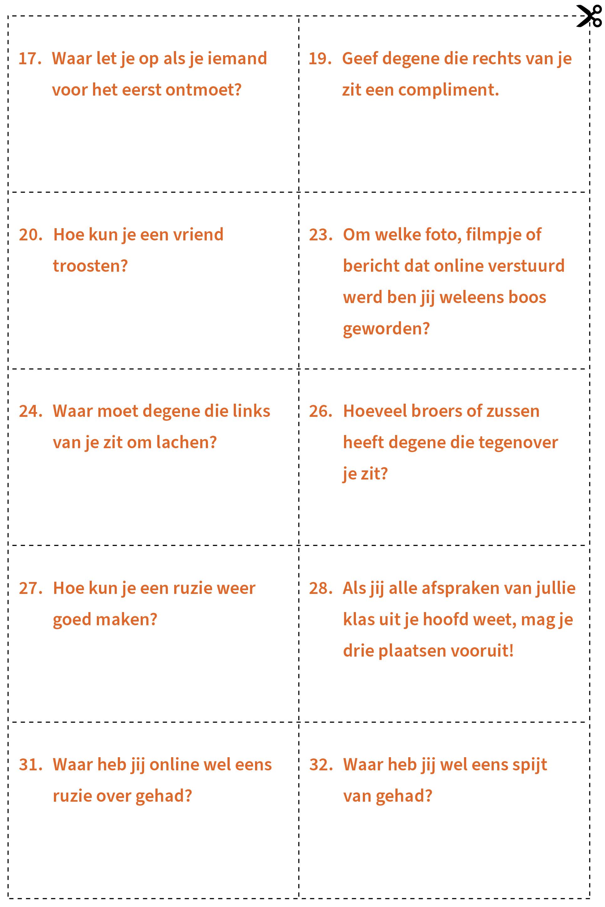 De leerlingen krijgen vragen en opdrachten over contact maken, vrienden maken en aspecten die daarmee samenhangen. Aan de hand van dit spel kunnen leerlingen ook kijken hoe goed ze elkaar al kennen.