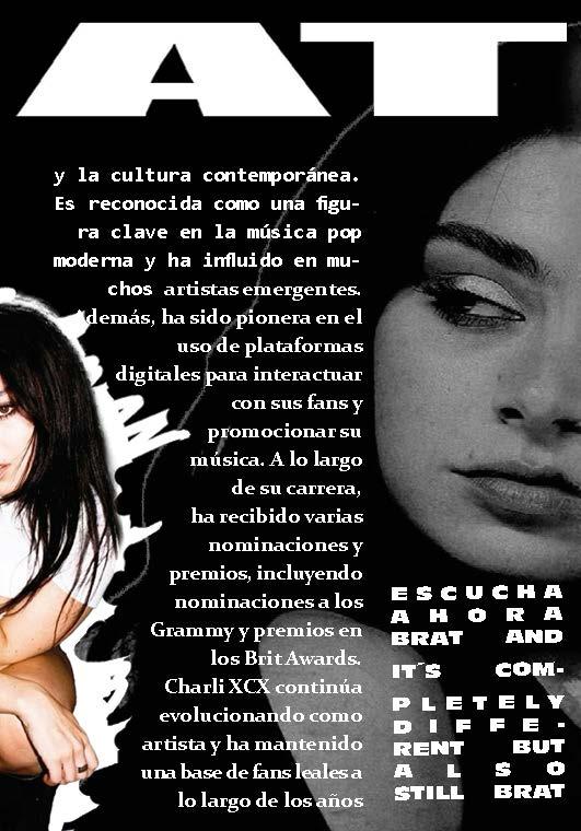 BRAT es un album de Charli XCX lanzado en 2024. Este proyecto se destaca por su estilo experimental y se inspira en el hiperpop y el sonido futurista que caracteriza el trabajo de Charli, especialmente en colaboración con productores como A. G. Cook, EASYFUN, Hudson Mohawke, George Daniel y más. El album captura una vibra rebelde y despreocupada, como sugiere el título (“brat” significa “mocoso” o “niño malcriado”), y explora temas de individualidad, el autoempoderamiento, y el rechazo a las normas convencionales de la industria musical.