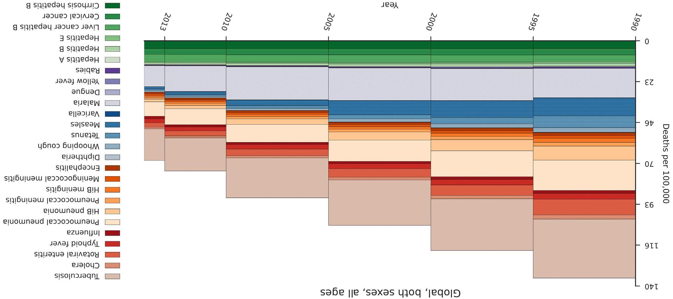 1 Global all ages death rate (per 100,000) for VPD current causes for both sexes combined in 1990, 1995, 2000, 2005, 2010, and 2013.