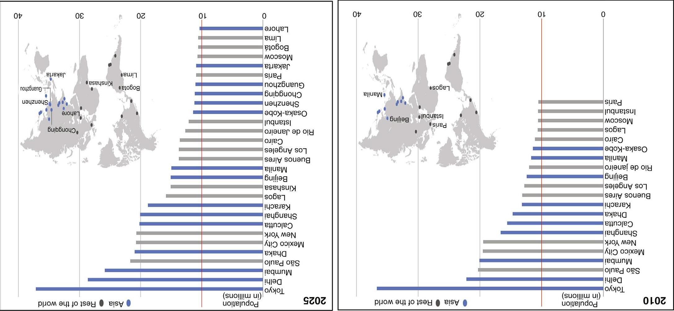 FIGURE 1.4 Predicted growth in megacities 2010–25—where a megacity is defined as having a population over 10 million people. (Source: UN World Urbanization Prospects: The 2009 Revision.)