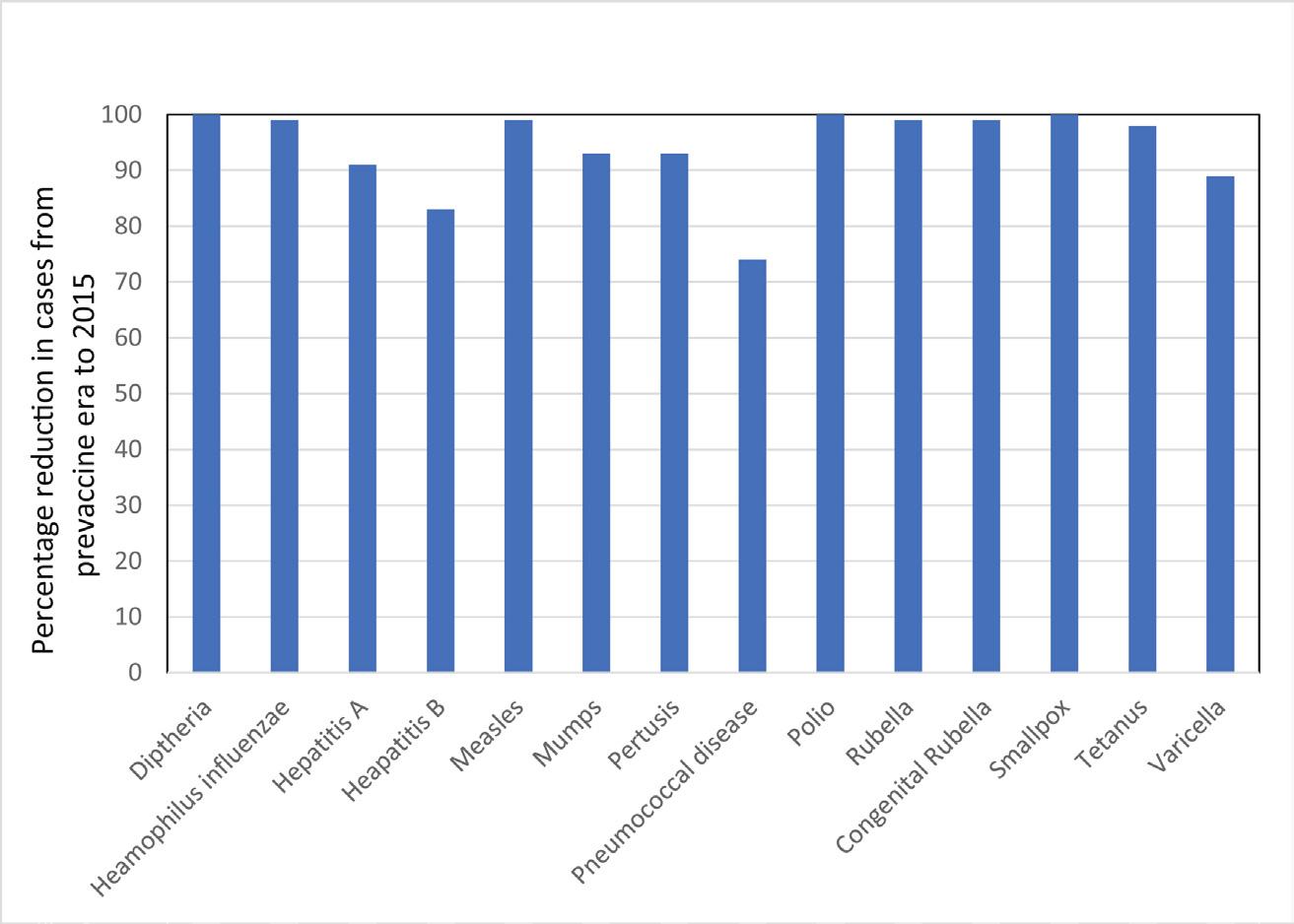 1.2 Impact of vaccination in the United States as reflected in the percentage reduction in cases from the prevaccine era to 2015. [Source: US Centres for Disease Control data (CDC) 2015.]