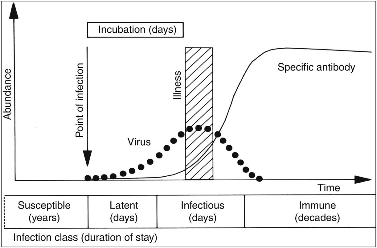 Two of the quantities in Eq. 1.1 are easily measured; namely, population size or density and the average duration of infectiousness based on house hold studies of person to person transmission. Fig. 1.6 records a schematic for acute viral infections showing how changes over time in viral abundance (viral load can be measured in a patient using quantitative PCR methods) are related to some common terms in clinical epidemiology—the latent period (not infectious), the incubation period (delay before symptoms appear), an illness period usually associated with high viraemia, the infectious period, and recovery plus immunity.