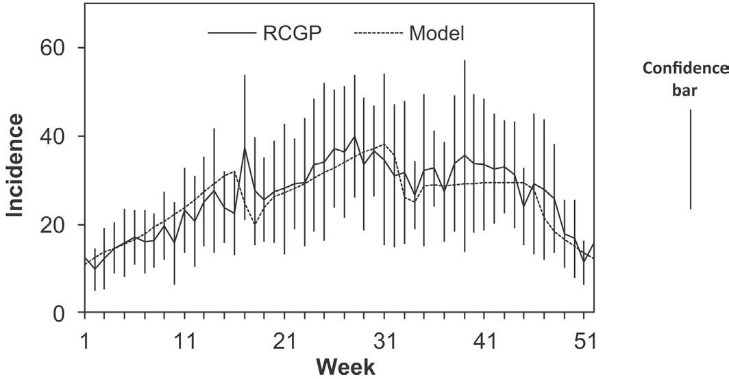 FIGURE 1.6 Patterns of seasonal measles incidence in England and Wales as reported by the Royal College of General Practitioners (RGCP). The model line reflects a fit to the observed data. Note the impact of school terms and holidays. The confidence bar reflects variation by year— with the solid line representing an average from many years.