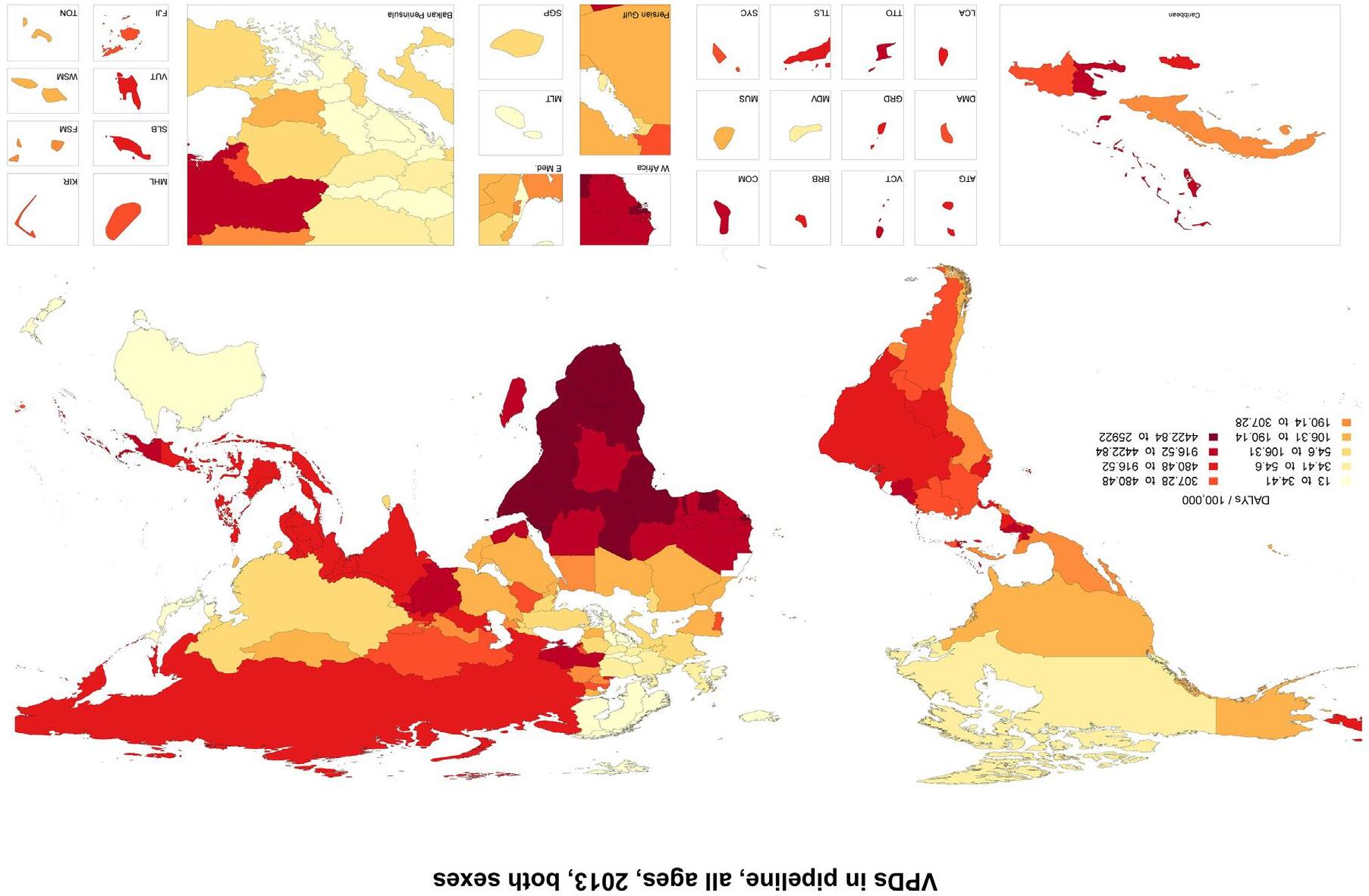 FIGURE 5 All ages DALYs rate (per 100,000) for combined VPD current causes for both sexes combined for 188 countries in 2013.