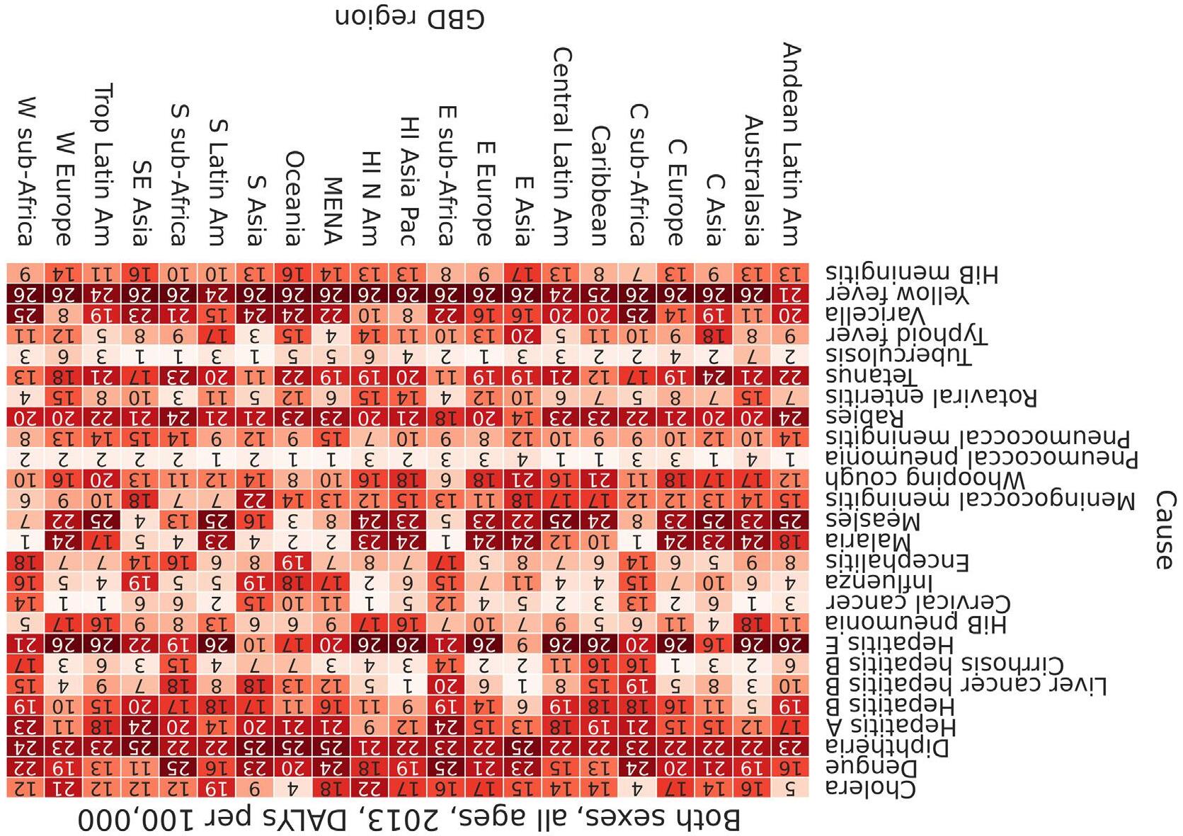 FIGURE 6 Heat map of leading causes associated with current vaccines by GBD region for both sexes combined in 2013.