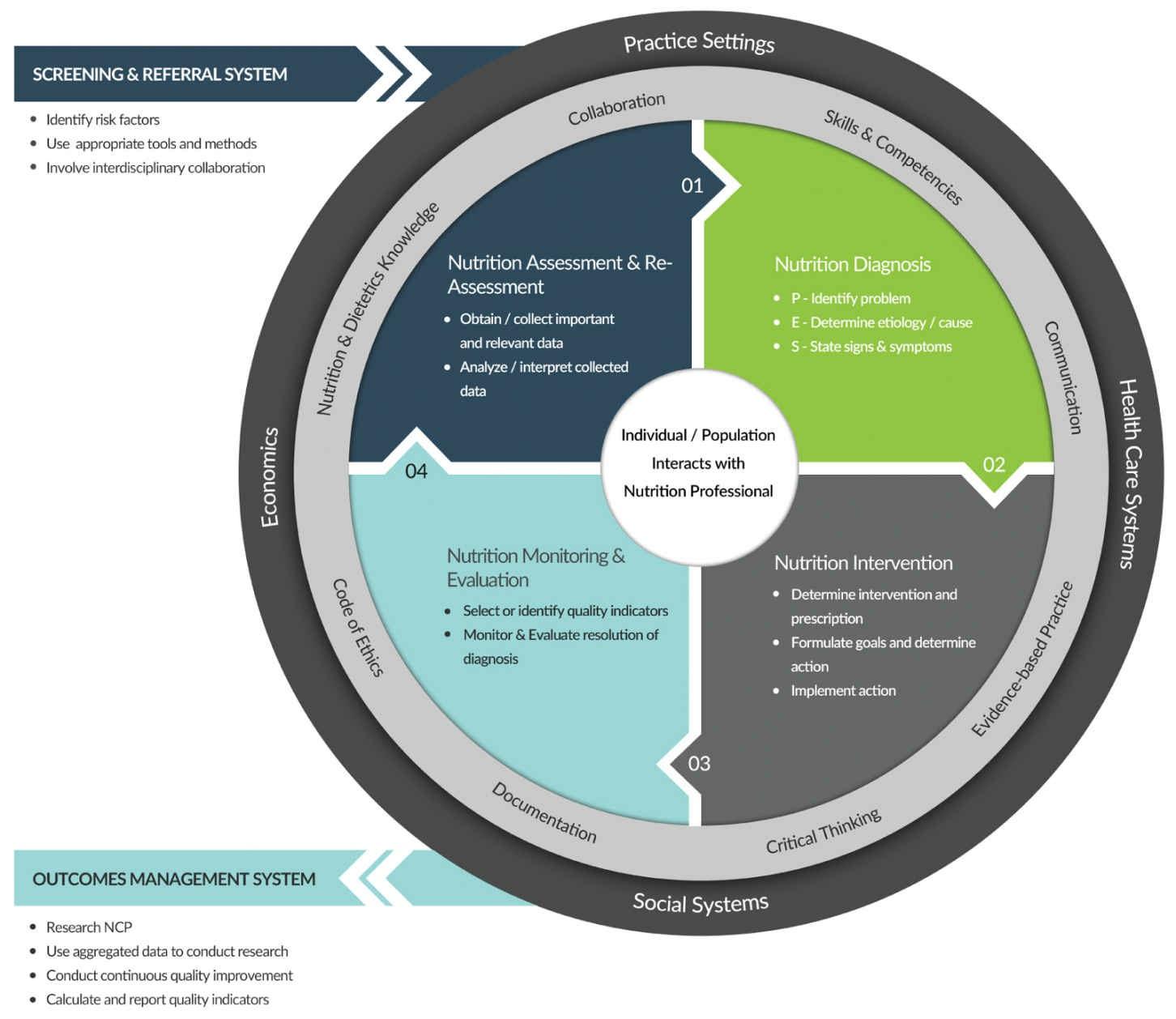 As part of the Scope of Practice, the Academy develops standards for evaluating the quality of practice and performanceofRDNsandNDTRs SOPsandSOPPsaretoolsforprofessionalstouseinself-evaluationand todeterminetheeducationandskillsnecessarytoadvancefromageneralisttospecialtyandadvancedlevelsof dietetics practice. The SOPs are based on the four steps in the NCP of nutrition assessment, nutrition diagnosis, nutrition intervention, and nutrition monitoring and evaluation and are related to patient care 20 TheSOPPscontainsixdimensionsofprofessionalperformance,includingthefollowing:provisionofservices, application of research, communication and application of knowledge, utilization and management of resources,qualityinpractice,andcompetencyandaccountability