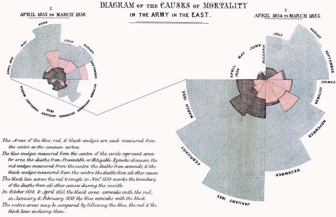 Figure1.3 FlorenceNightingale’spolarchartcomparingbattlefieldandnonbattlefield deaths. Source:https://en.wikipedia.org/wiki/Pie_chart#/media/File:Nightingale-mortality.jpg. Publicdomain.