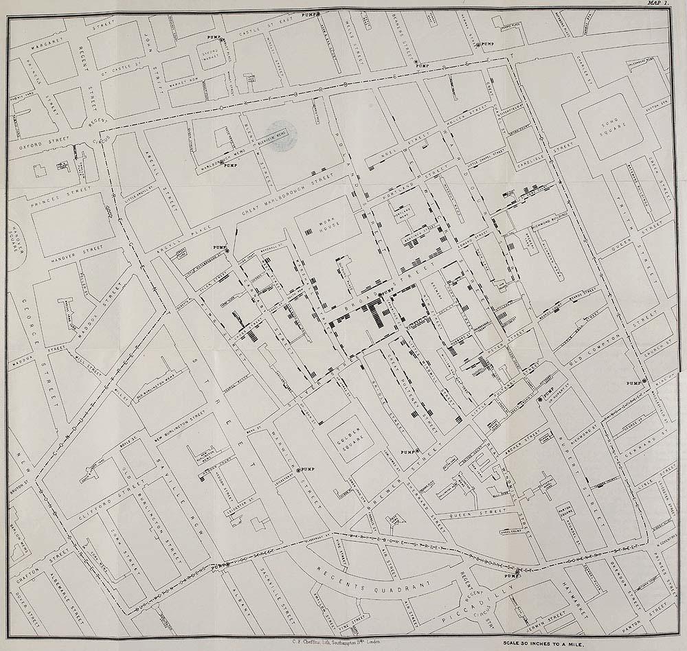 AnotherearlyuseofstatisticswasDrJohnSnow’smapshowingdeathsinthe housesofLondon’sSohoDistrictduringthe1854choleraepidemic,aspopularized byJohnson’sbook, TheGhostMap (2006).Inordertoinvestigatethereasonsforthe spreadofcholeraotherthanodor(“miasmatheory”),Snowcreatedamapshowing eachdeathasablacklineoutsideeachhousehold,alongwithfeaturesoftheneighborhoodincludingthewatersourceslocatedthroughoutthedistrict.Themapcreated avisualpictureoftheconcentrationofdeathsacrossthedistrictandledtohypothesesaboutcholeraspreadingbywaterbornecontaminationratherthansmell.(Ifyou weretowalkacrossthesameLondondistricttoday,youwillseethatthegreatsocial theoristKarlMarxlivedjustafewstreetsawayfromthecenterofthecholeradeaths.)