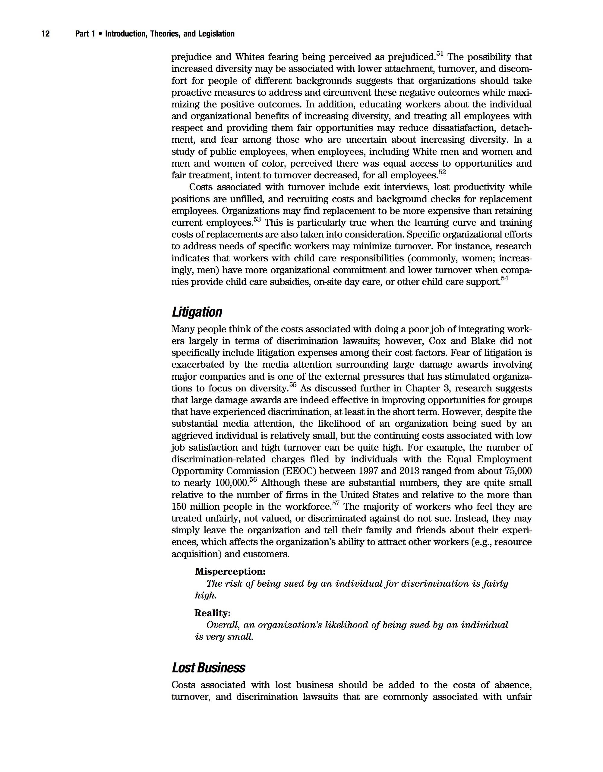 This book is relevant to large and small companies, colleges and universities, religious organizations, military organizations, hospitals, and any other organizations in which people work or wish to work or that have clients, customers, or constituents. Although under U.S. laws some organizations (e.g., churches and private clubs) may be allowed to prefer certain types of people over others as employees, many of the concepts in this book also apply to such organizations and can be of benefit to their leaders. For example, religious organizations may legally require that employees be members of a particular faith, yet they will likely have employees with work and family issues or may be wrestling with the issue of ordaining women. Similarly, the U.S. military is a unique male-dominated organization, yet its issues with sexual harassment and sexual orientation diversity can help inform other types of organizations dealing with the same issues. Hospitals have to learn to address patient racism and sexism, and need to be cognizant of cultural differences related to medical care. 24 As will be apparent from the variety of organizations discussed in