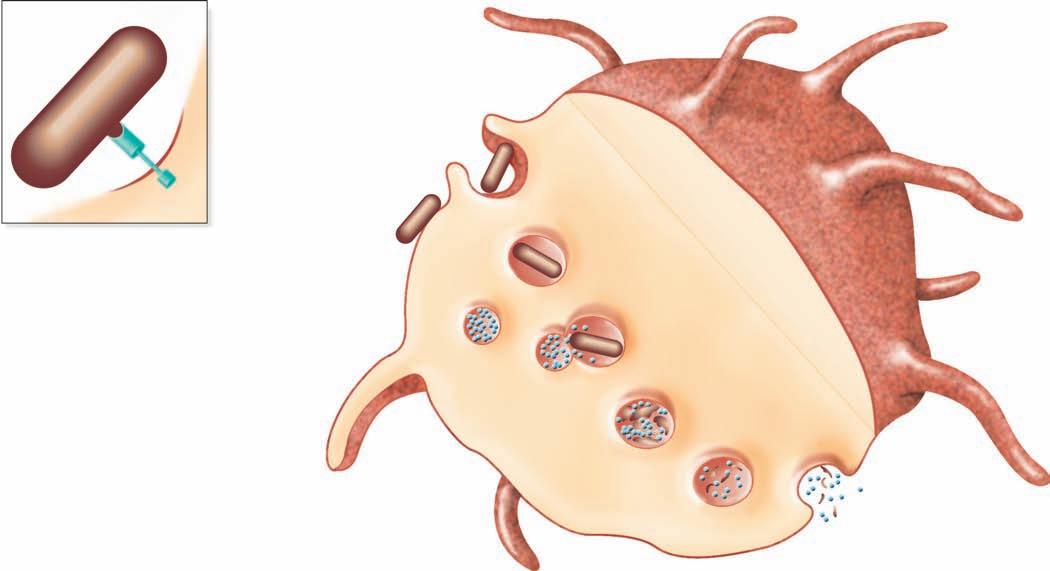 ■ Figure 1.8 (a) The phagocytic process, beginning in the upper left with bacterial attachment and phagocytic cell pseudopod formation, followed by ingestion with the bacteria in a phagosome. The phagosome is joined by a lysosome to create a phagolysosome, the microbe is digested, and waste products are excreted. Some processed peptides from the pathogen may be presented to T cells by this antigen presenting cell. Source: TORTORA, GERARD J.; FUNKE, BERDELL R.; CASE, CHRISTINE L., MICROBIOLOGY: AN INTRODUCTION, 10th, ©2010. Printed and Electronically reproduced by permission of Pearson Education, Inc., Upper Saddle River, New Jersey. (b) Scanning electron microscopy showing a phagocytic cell in the process of phagocytizing bacteria. Source: © Juergen Berger/Photo Researchers, Inc.
