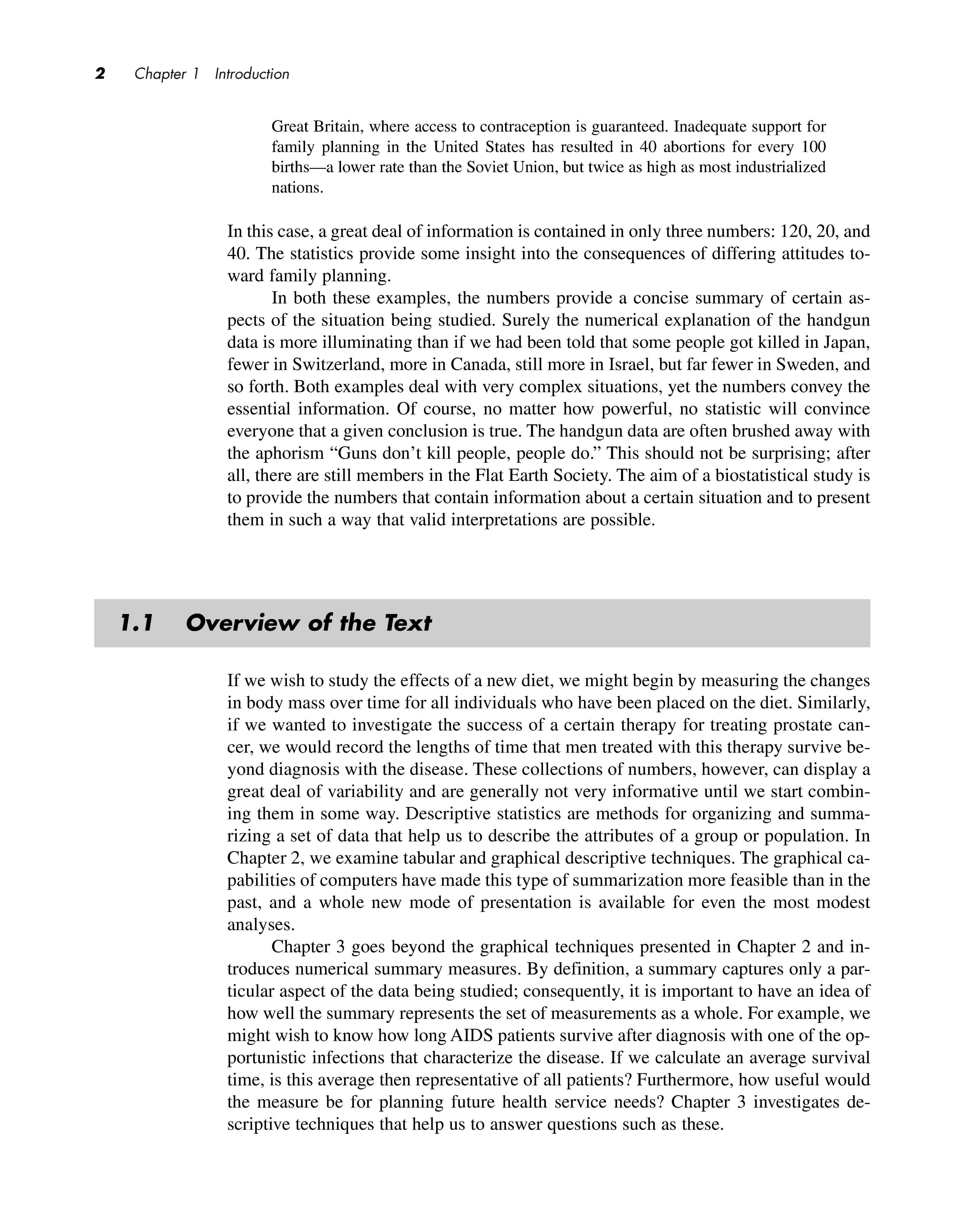 In both these examples, the numbers provide a concise summary of certain aspects of the situation being studied. Surely the numerical explanation of the handgun data is more illuminating than if we had been told that some people got killed in Japan, fewer in Switzerland, more in Canada, still more in Israel, but far fewer in Sweden, and so forth. Both examples deal with very complex situations, yet the numbers convey the essential information. Of course, no matter how powerful , no statistic will convince everyone that a given conclusion is true The handgun data are often brushed away with the aphorism "Guns don't kill people, people do." This should not be surprising; after all, there are still members in the Flat Earth Society. The aim of a biostatistical study is to provide the numbers that contain information about a certain situation and to present them in such a way that valid interpretations are possible