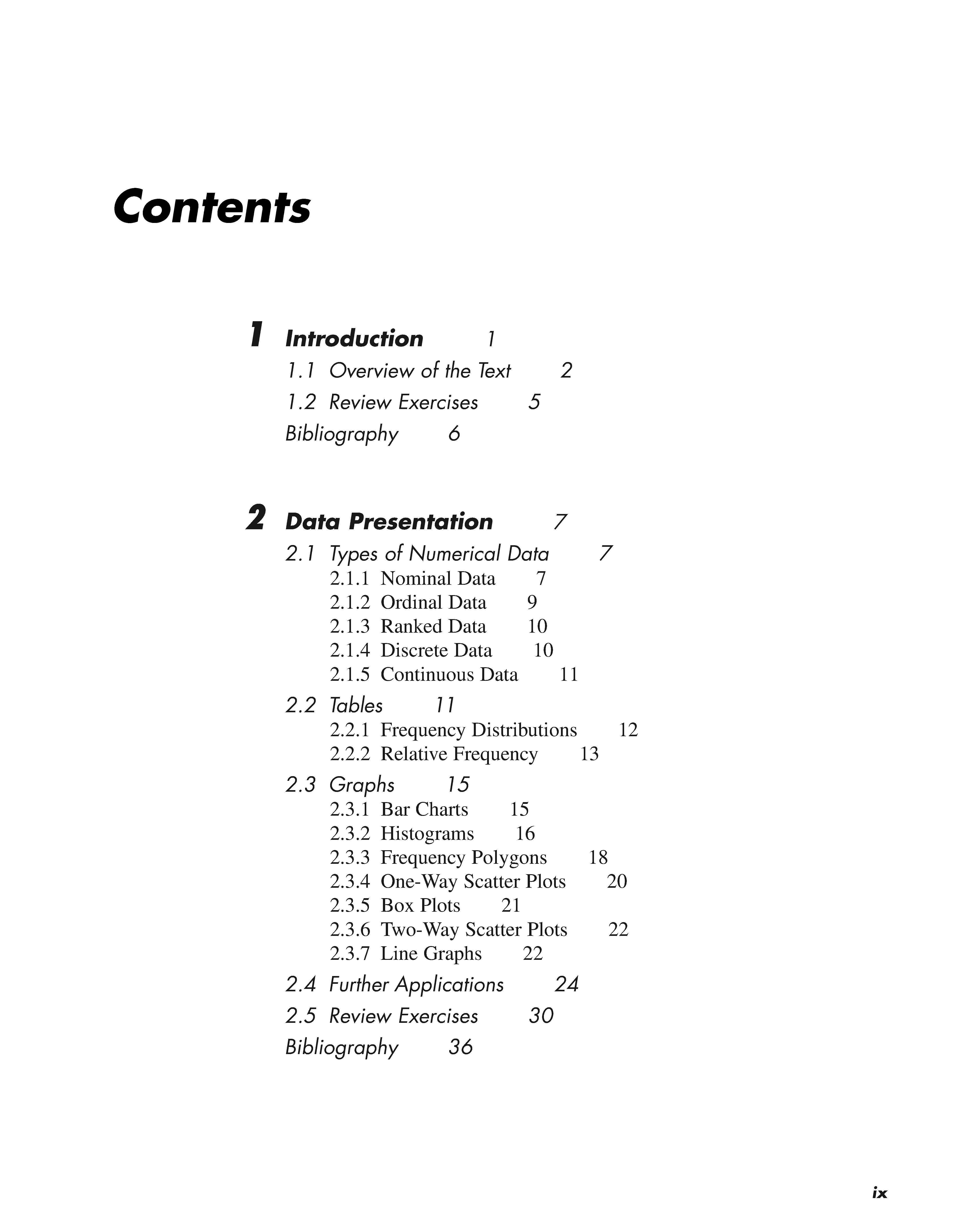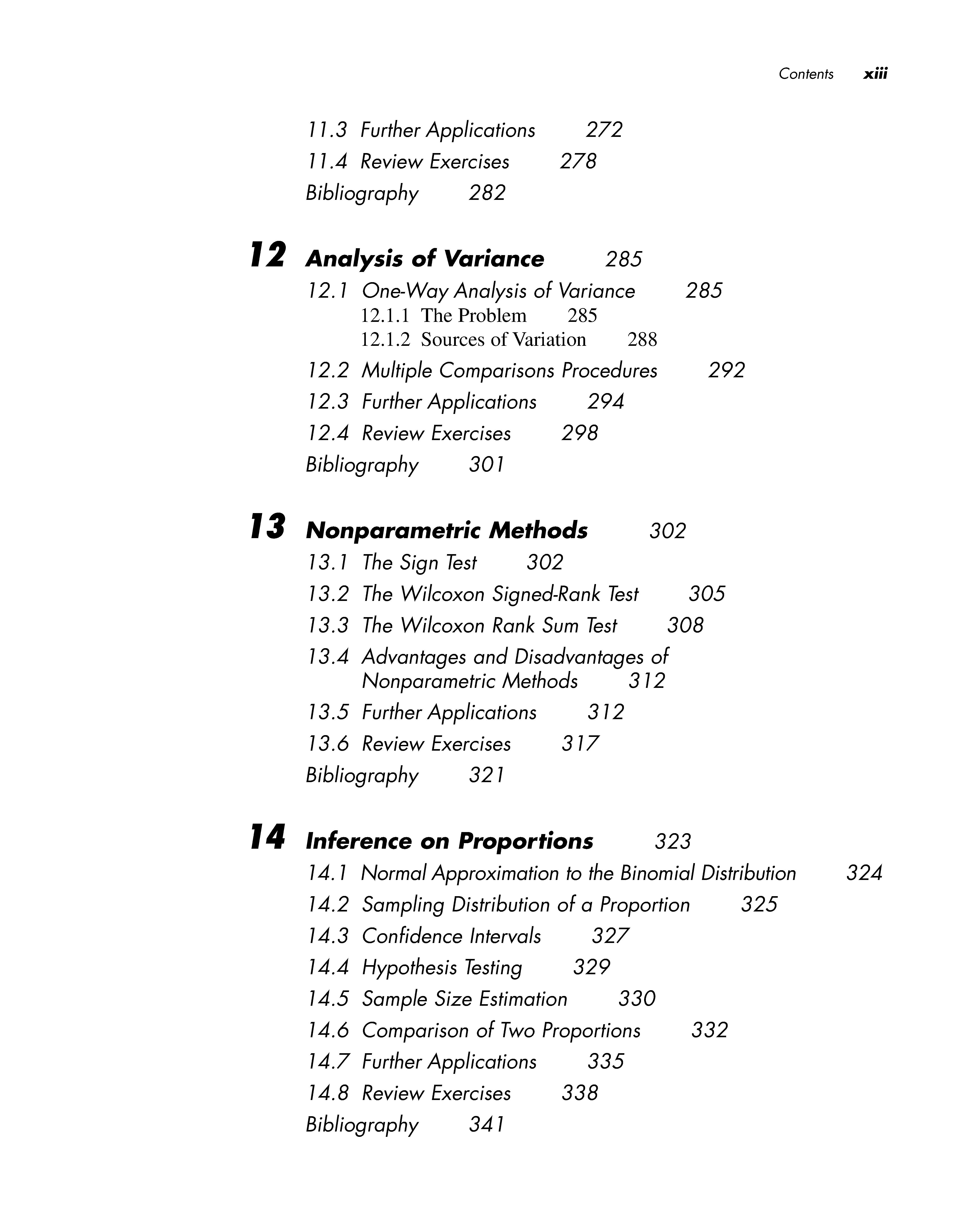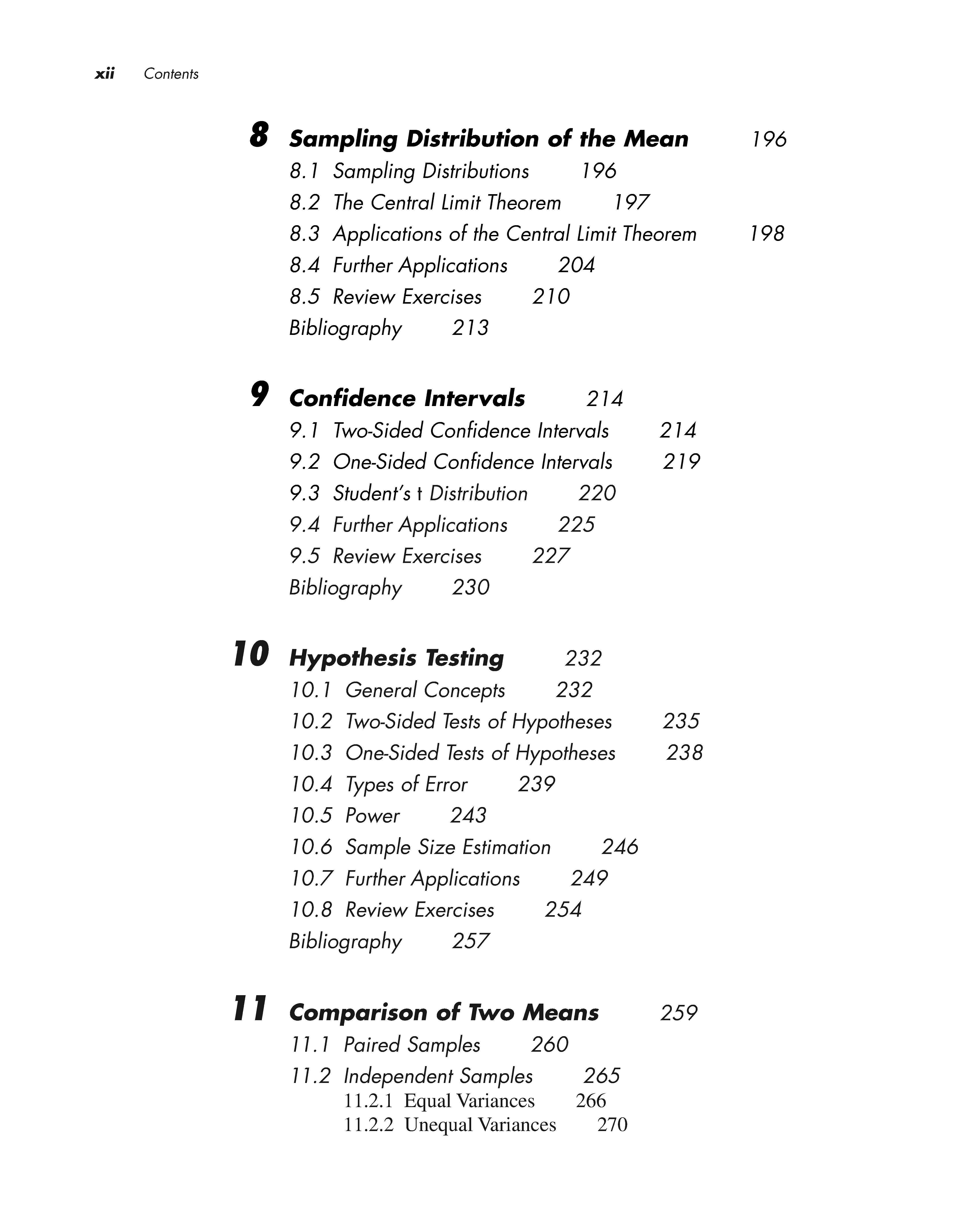 For a study to be of any practical value, we must be able to extrapolate its findings to a larger group or population. To this end, confidence intervals and hypothesis testing are introduced in Chapters 9 and 10. These techniques are essentially methods for drawing a conclusion about the population we have sampled, while at the same time having some knowledge of the likelihood that the conclusion is incorrect. These ideas are first applied to the mean of a single population. For instance, we might wish to estimate the mean concentration of a certain pollutant in a reservoir supplying water to the surrounding area, and then determine whether the true mean level is higher than the maximum concentration allowed by the Environmental Protection Agency. In Chapter 11, the theory is extended to the comparison of two population means; it is further generalized to the comparison of three or more means in Chapter 12. Chapter 13 continues the development of hypothesis testing concepts, but introduces techniques that allow the relaxation of some of the assumptions necessary to carry out the tests. Chapters 14, 15, and 16 develop inferential methods that can be applied to enumerated data or countssuch as the numbers of cases of sudden infant death syndrome among children put to sleep in various positions-rather than continuous measurements.