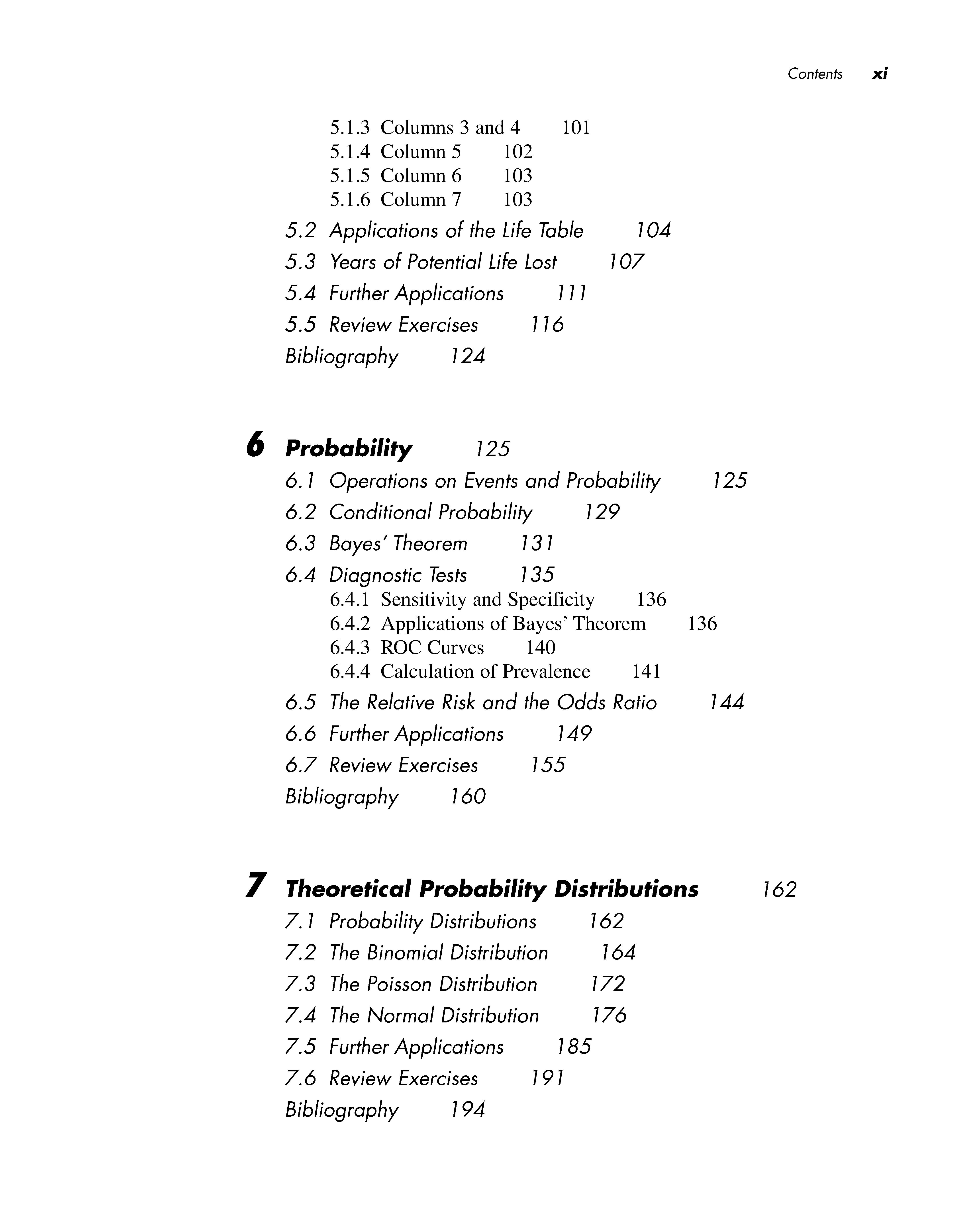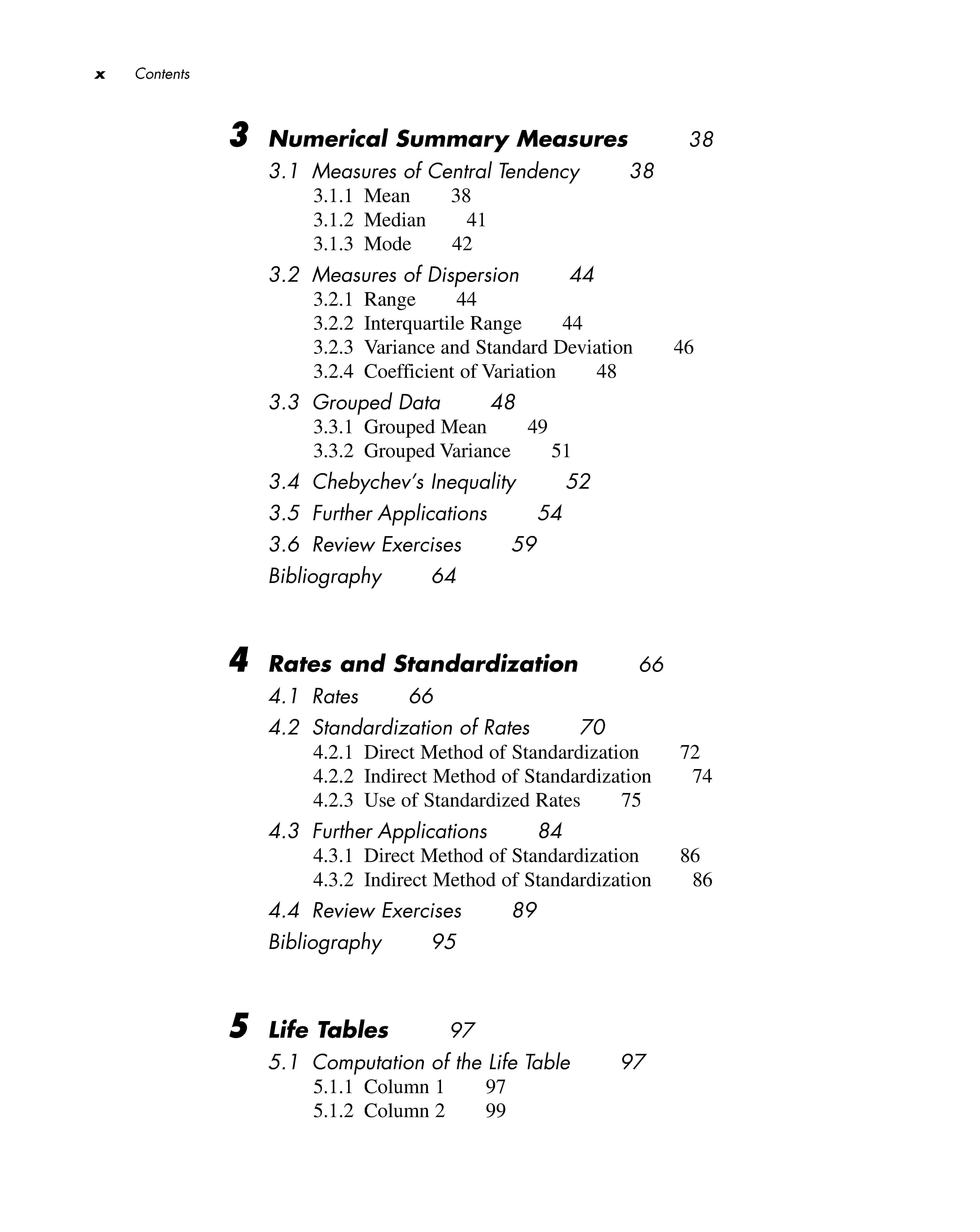 Chapter 5 introduces the life table, one of the most important techniques available for study in the health sciences. Life tables are used by public health professionals to characterize the well-being of a population, and by insurance companies to predict how long a particular individual will live. In this chapter, the study of mortality begun in Chapter 4 is extended to incorporate the actual time to death for each individual; this results in a more refined analysis. Knowing these times to death also provides a basis for calculating the survival curve for a population. This measure of longevity is used frequently in clinical trials designed to study the effects of various drugs and surgical treatments on survival time.
