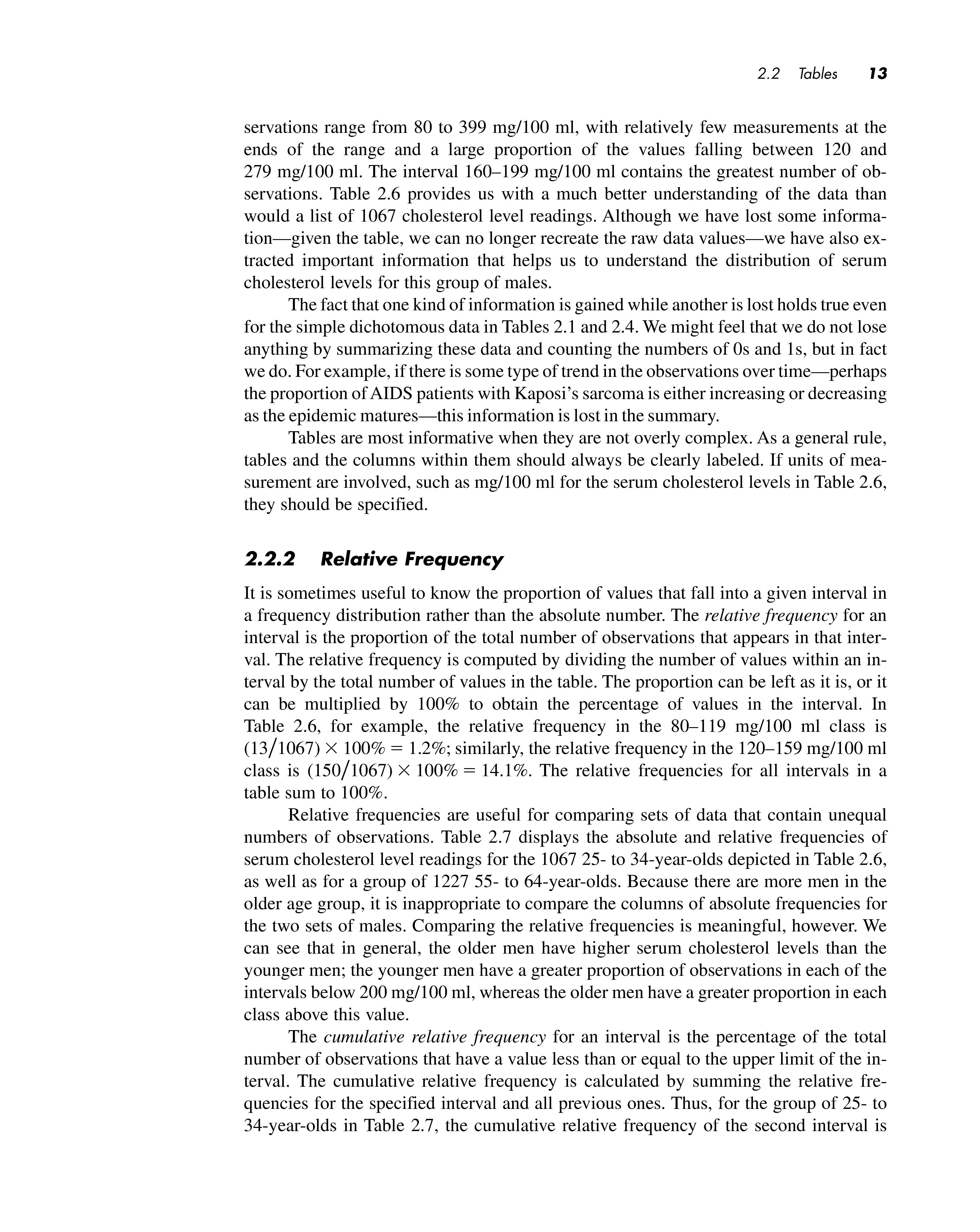 Tables are most informative when they are not overly complex. As a general rule, tables and the columns within them should always be clearly labeled. If units of measurement are involved, such as mg/100 ml for the serum cholesterol levels in Table 2.6, they should be specified.