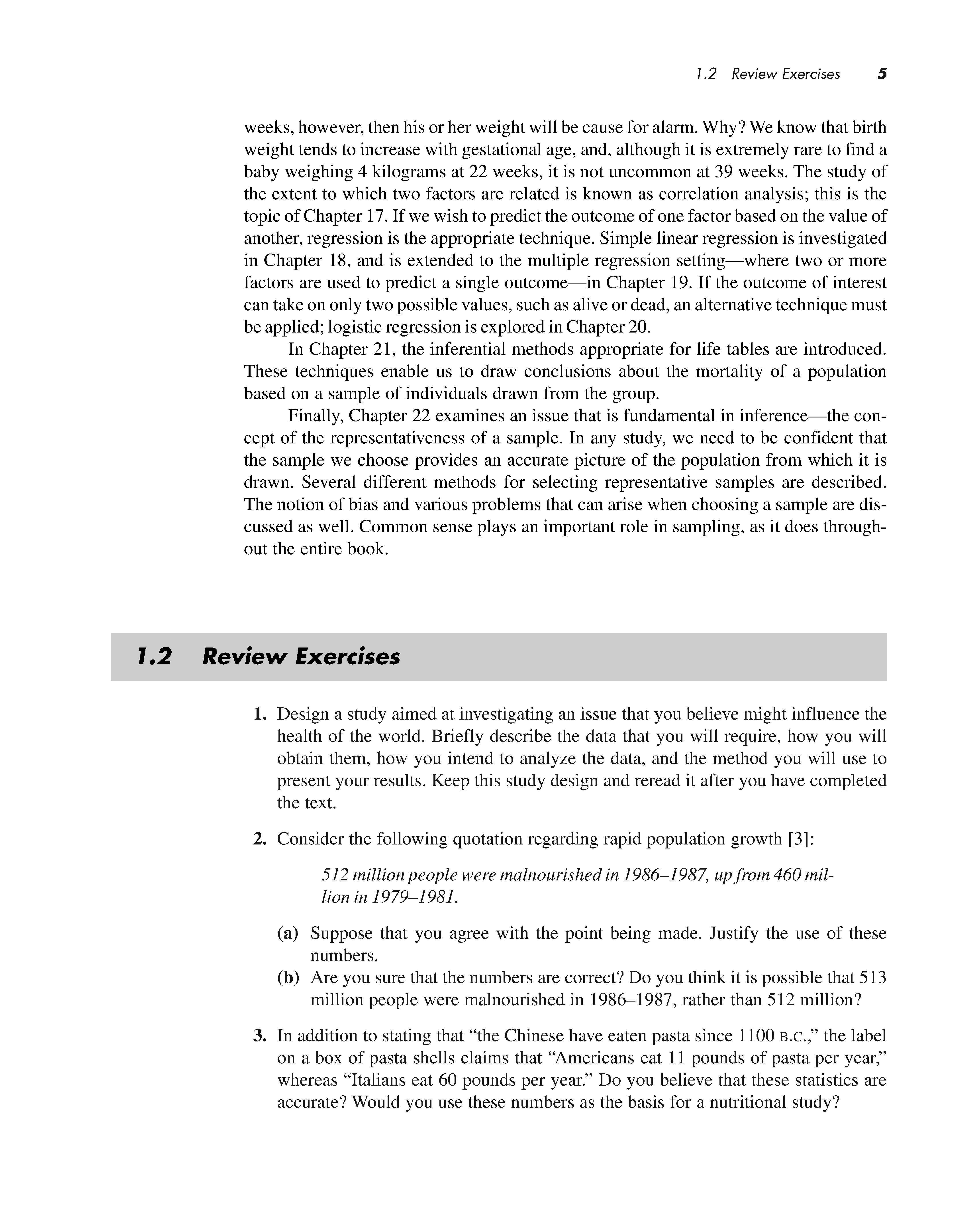 Finally, Ch a pter 22 examines an issue th a t is fundamental in inference-the concept of the representativeness of a sample. In any s tudy, we need to be confident th a t the sample we choose provides an accurate picture of the population from which it is drawn . Several different methods for se lecting representative samp le s are de scri bed. The notion of bias and various problems that can arise when choosing a sample are discussed as well. Common sense play s an important role in sam pling , as it doe s throughout the entire book .