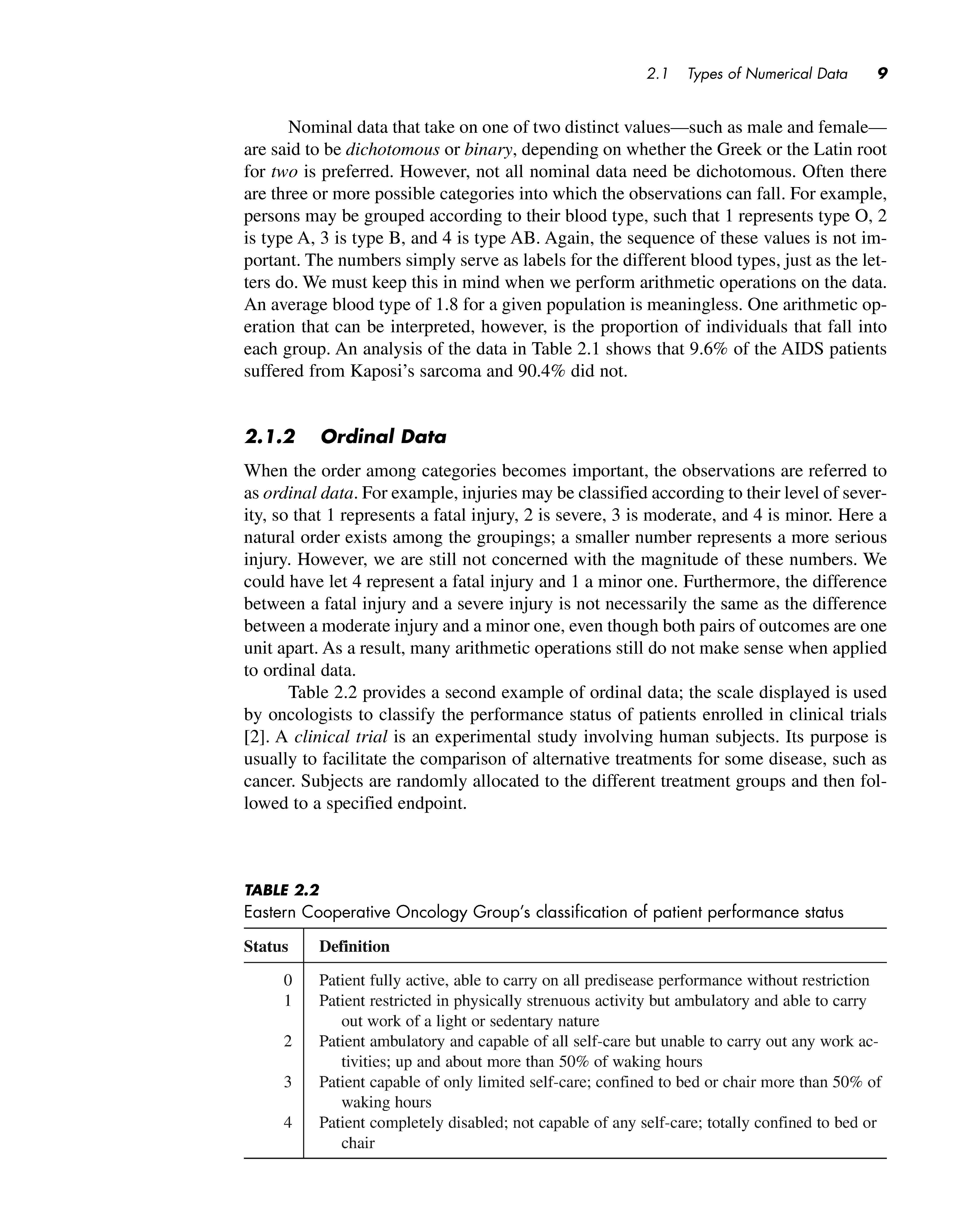 Table 2.2 provides a second example of ordinal data ; the scale displayed is used by oncologists to classify the performance status of patients enrolled in clinical trials [2]. A clinical trial is an experimental study involving human subjects. Its purpose is usually to facilitate the comparison of alternative treatments for some disease, such as cancer. Subjects are randomly allocated to the different treatment groups and then followed to a specified endpoint.