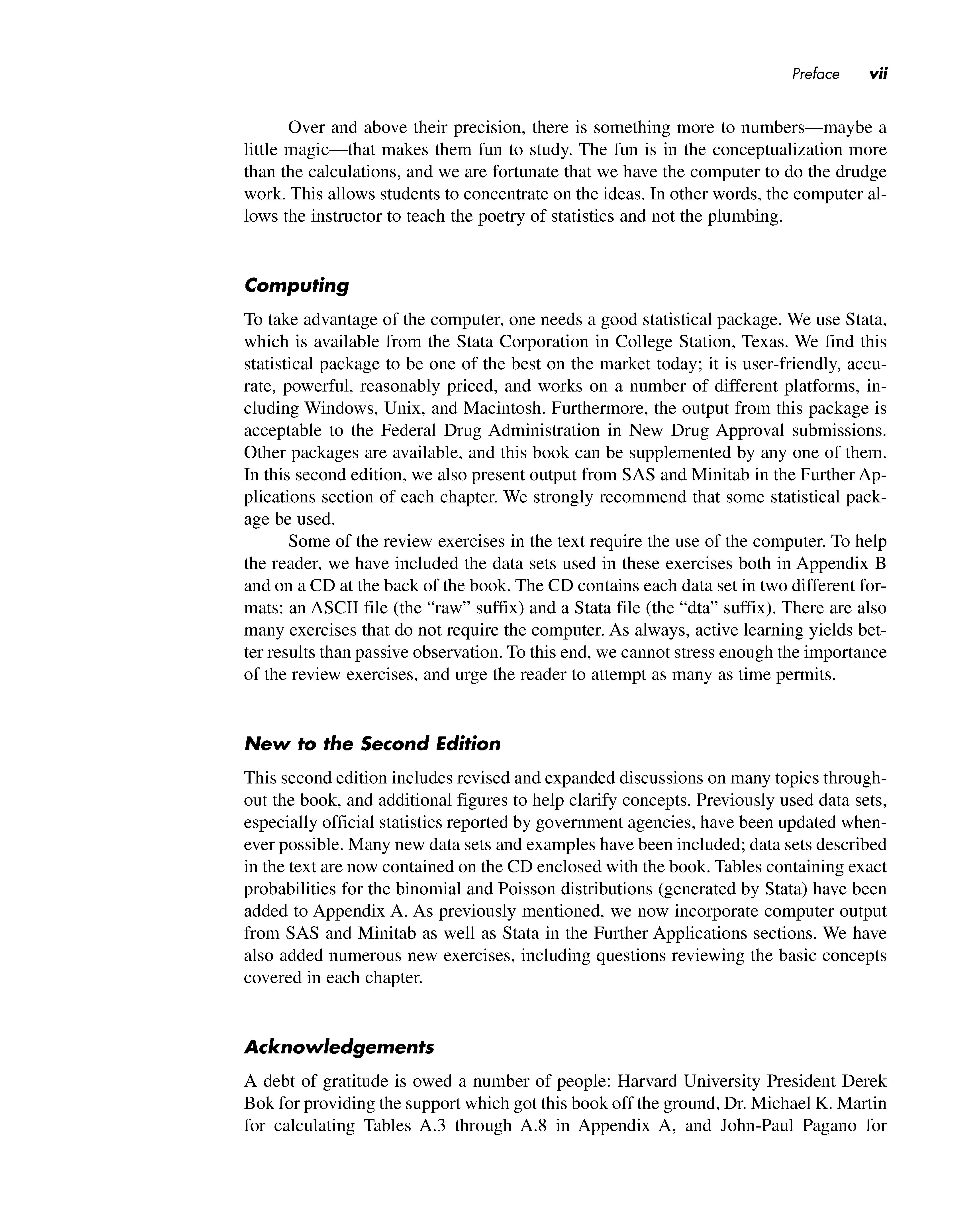 This second edition includes revised and expanded discussions on many topics throughout the book, and additional figures to help clarify concepts. Previously used data sets, especially official statistics reported by government agencies, have been updated whenever possible. Many new data sets and examples have been included; data sets described in the text are now contained on the CD enclosed with the book. Tables containing exact probabilities for the binomial and Poisson distributions (generated by Stata) have been added to Appendix A. As previously mentioned, we now incorporate computer output from SAS and Minitab as well as Stata in the Further Applications sections. We have also added numerous new exercises, including questions reviewing the basic concepts covered in each chapter.