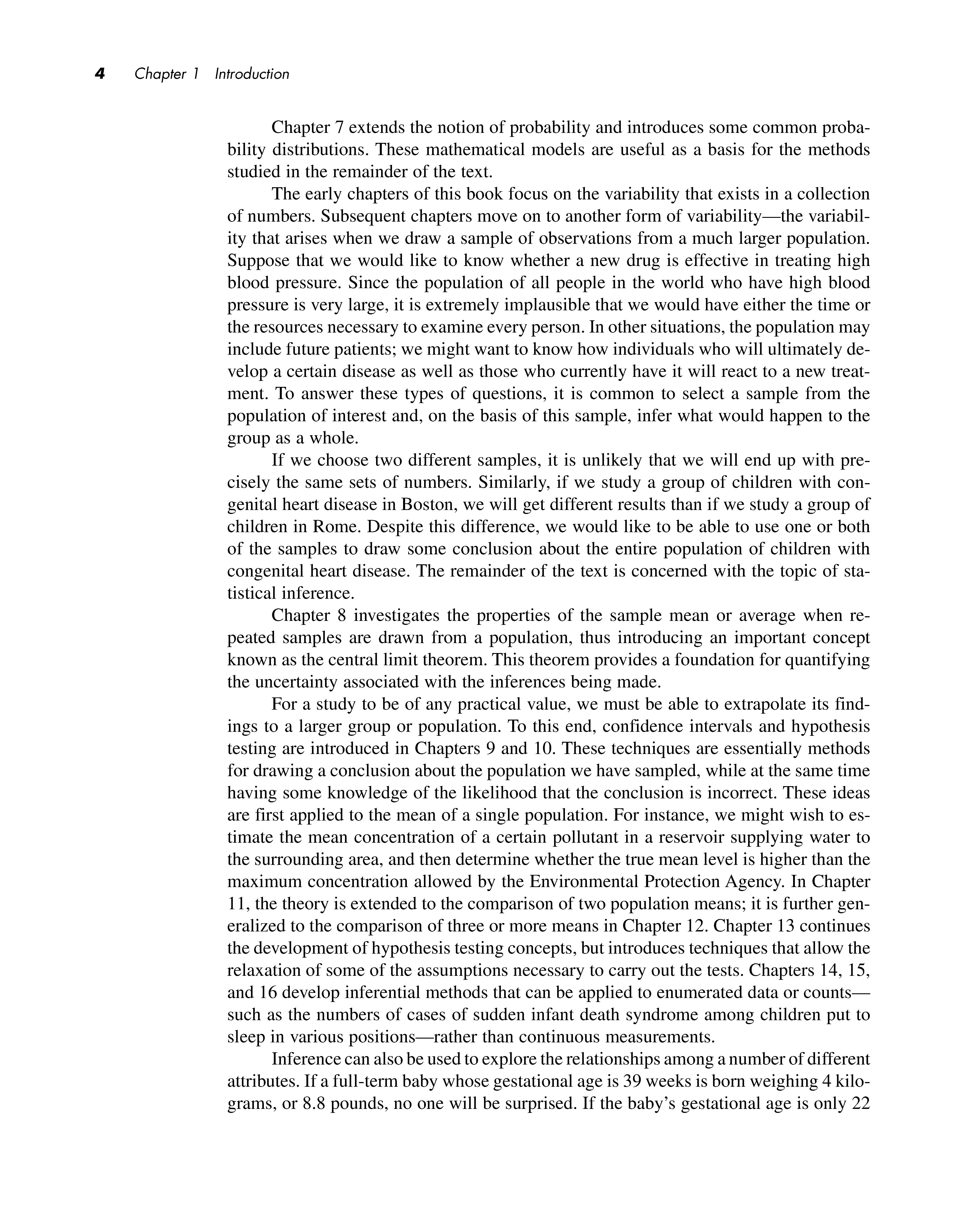 The early chapters of this book focus on the variability that exists in a collection of numbers. Subsequent chapters move on to another form of variability-the variability that arises when we draw a sample of observations from a much larger population. Suppose that we would like to know whether a new drug is effective in treating high blood pressure. Since the population of all people in the world who have high blood pressure is very large, it is extremely implausible that we would have either the time or the resources necessary to examine every person. In other situations, the population may include future patients; we might want to know how individuals who will ultimately develop a certain disease as well as those who currently have it will react to a new treatment. To answer these types of questions, it is common to select a sample from the population of interest and, on the basis of this sample, infer what would happen to the group as a whole.