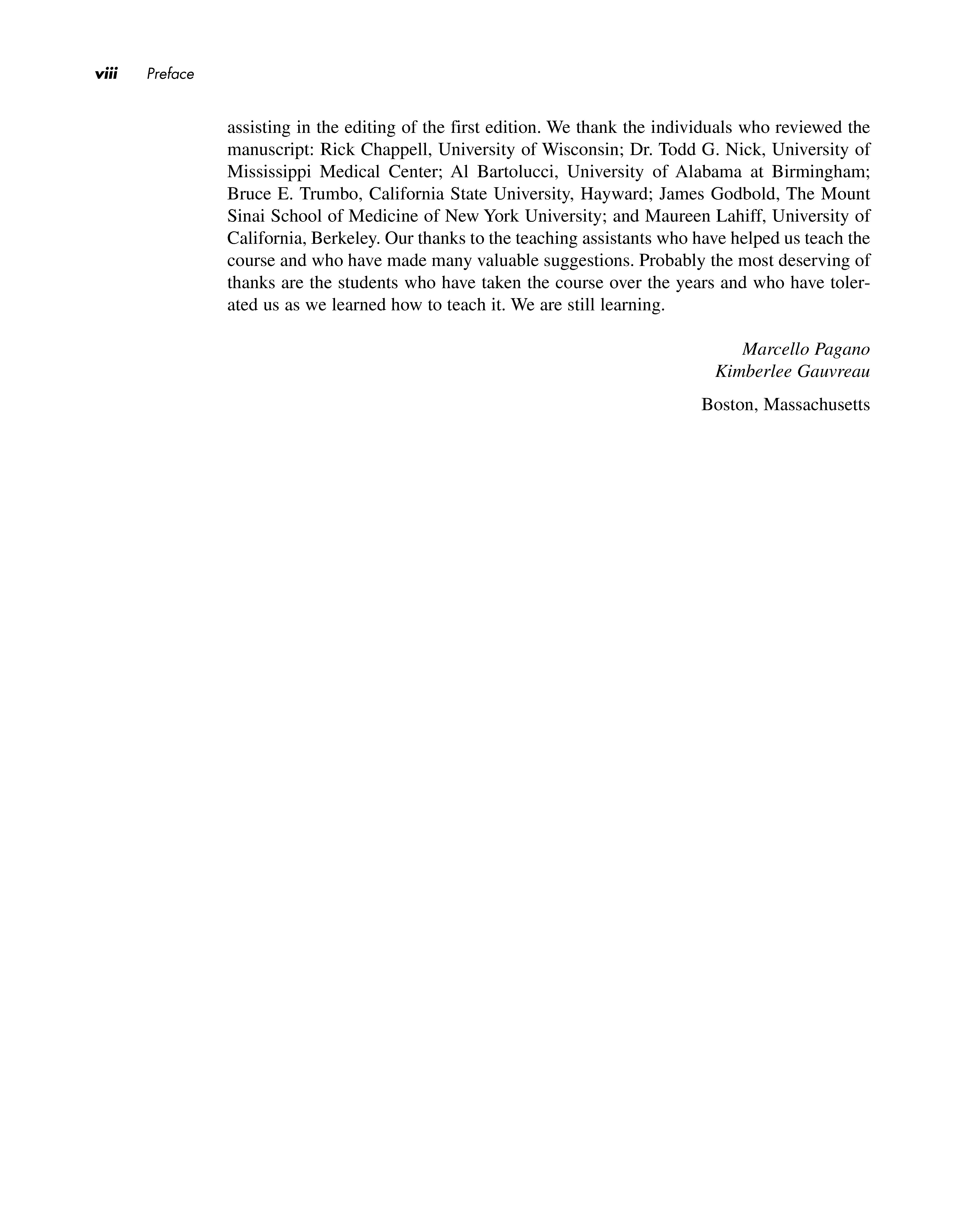 assisting in the editing of the first edition. We thank the individuals who reviewed the manuscript: Rick Chappell, University of Wisconsin; Dr. Todd G. Nick, University of Mississippi Medical Center; Al Bartolucci, University of Alabama at Birmingham; Bruce E. Trumbo, California State University, Hayward; James Godbold, The Mount Sinai School of Medicine of New York University; and Maureen Lahiff, University of California, Berkeley. Our thanks to the teaching assistants who have helped us teach the course and who have made many valuable suggestions. Probably the most deserving of thanks are the students who have taken the course over the years and who have tolerated us as we learned how to teach it. We are still learning.