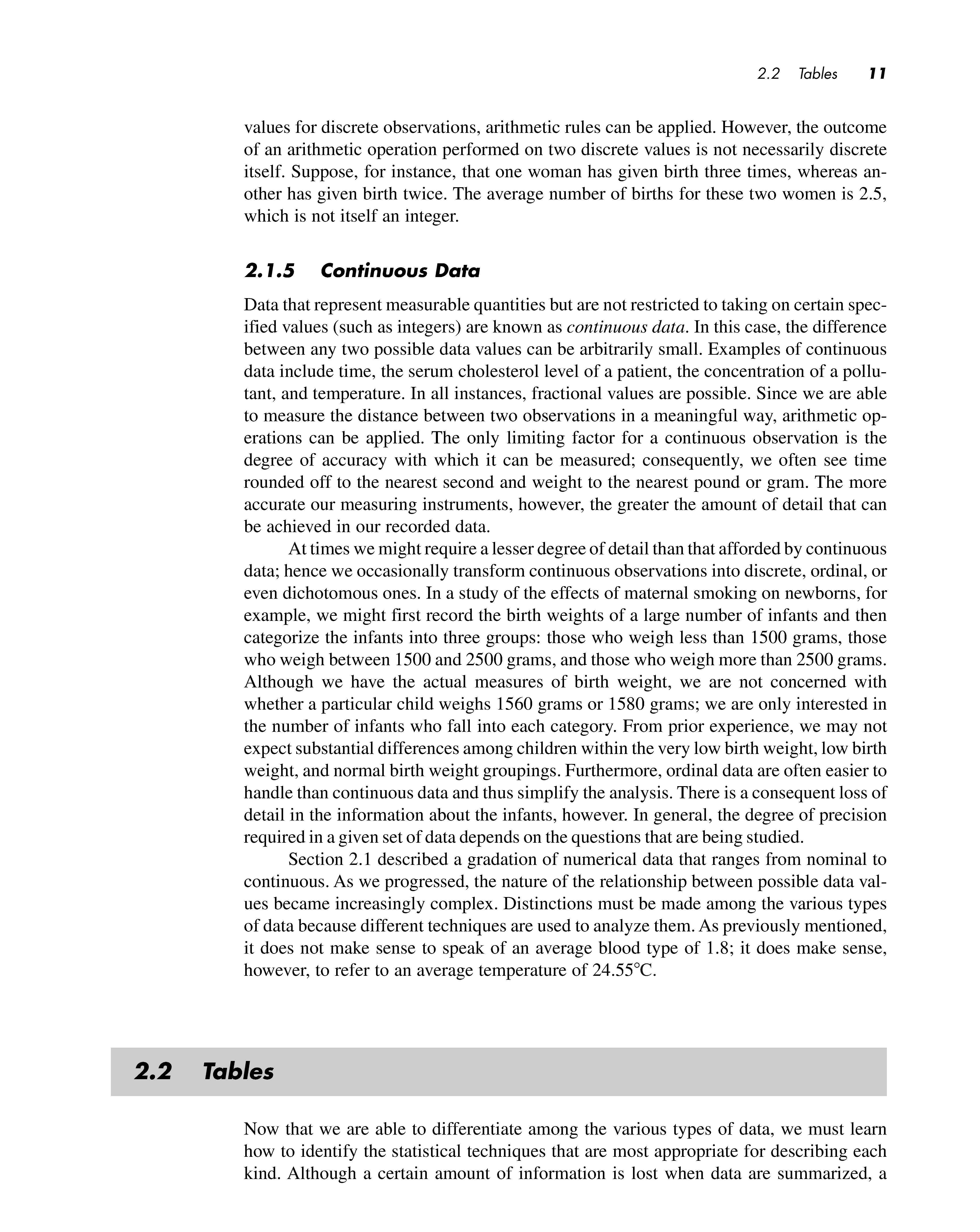 At times we might require a lesser degree of detail than that afforded by continuous data; hence we occasionally transform continuous observations into discrete , ordinal, or even dichotomous ones. In a study of the effects of maternal smoking on newborns , for example, we might first record the birth weights of a large number of infants and then categorize the infants into three groups: those who weigh less than 1500 grams , those who weigh between 1500 and 2500 grams, and those who weigh more than 2500 grams. Although we have the actual measures of birth weight , we are not concerned with whether a particular child weighs 1560 grams or 1580 grams; we are only interested in the number of infants who fall into each category. From prior experience , we may not expect substantial differences among children within the very low birth weight, low birth weight, and normal birth weight groupings. Furthermore , ordinal data are often easier to handle than continuous data and thus simplify the analysis. There is a consequent loss of detail in the information about the infants , however. In general, the degree of precision required in a given set of data depends on the questions that are being studied.