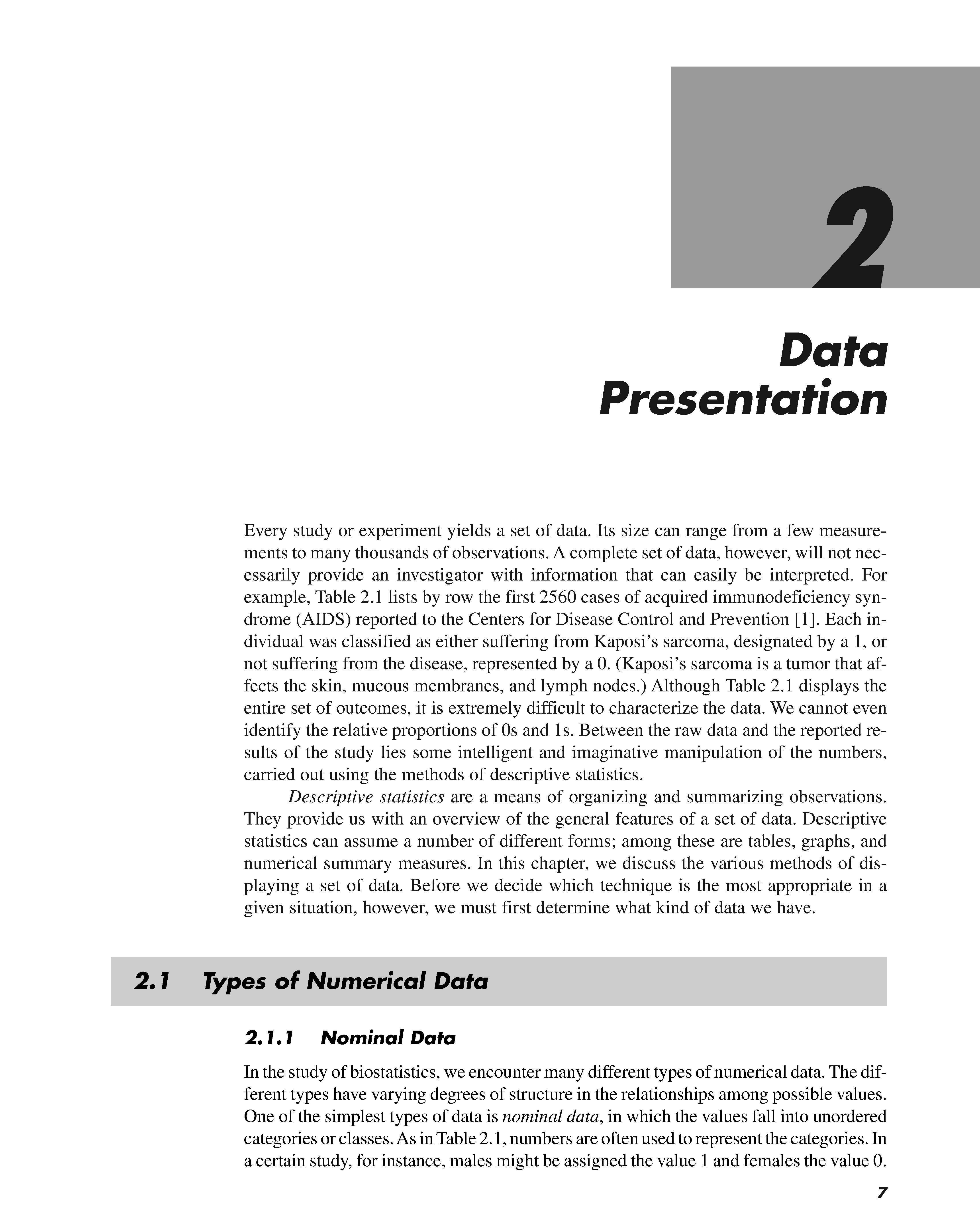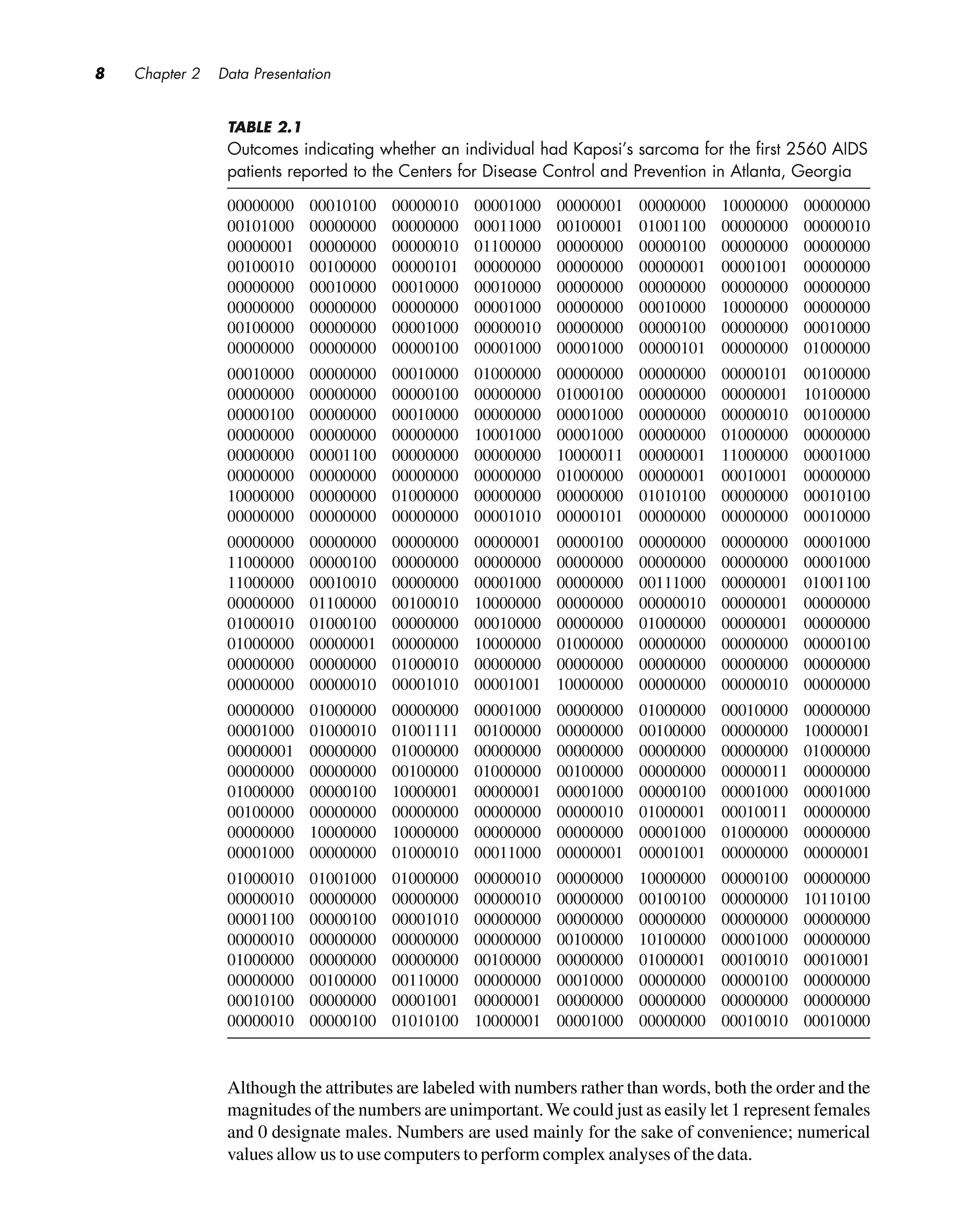 Every study or experiment yields a set of data. Its size can range from a few measurements to many thousands of observations . A complete set of data , however, will not necessarily provide an investigator with information that can easily be interpreted. For example , Table 2.1 lists by row the first 2560 cases of acquired immunodeficiency syndrome (AIDS) reported to the Centers for Disease Control and Prevention [1] . Each individual was classified as either suffering from Kaposi ' s sarcoma , designated by a 1, or not suffering from the disease, represented by a 0 . (Kaposi ' s sarcoma is a tumor that affects the skin , mucous membranes , and lymph nodes.) Although Table 2.1 displays the entire set of outcomes , it is extremely difficult to characterize the data . We cannot even identify the relative proportions of Os and 1s . Between the raw data and the reported results of the study lies some intelligent and imaginative manipulation of the numbers , carried out using the methods of descriptive statistics