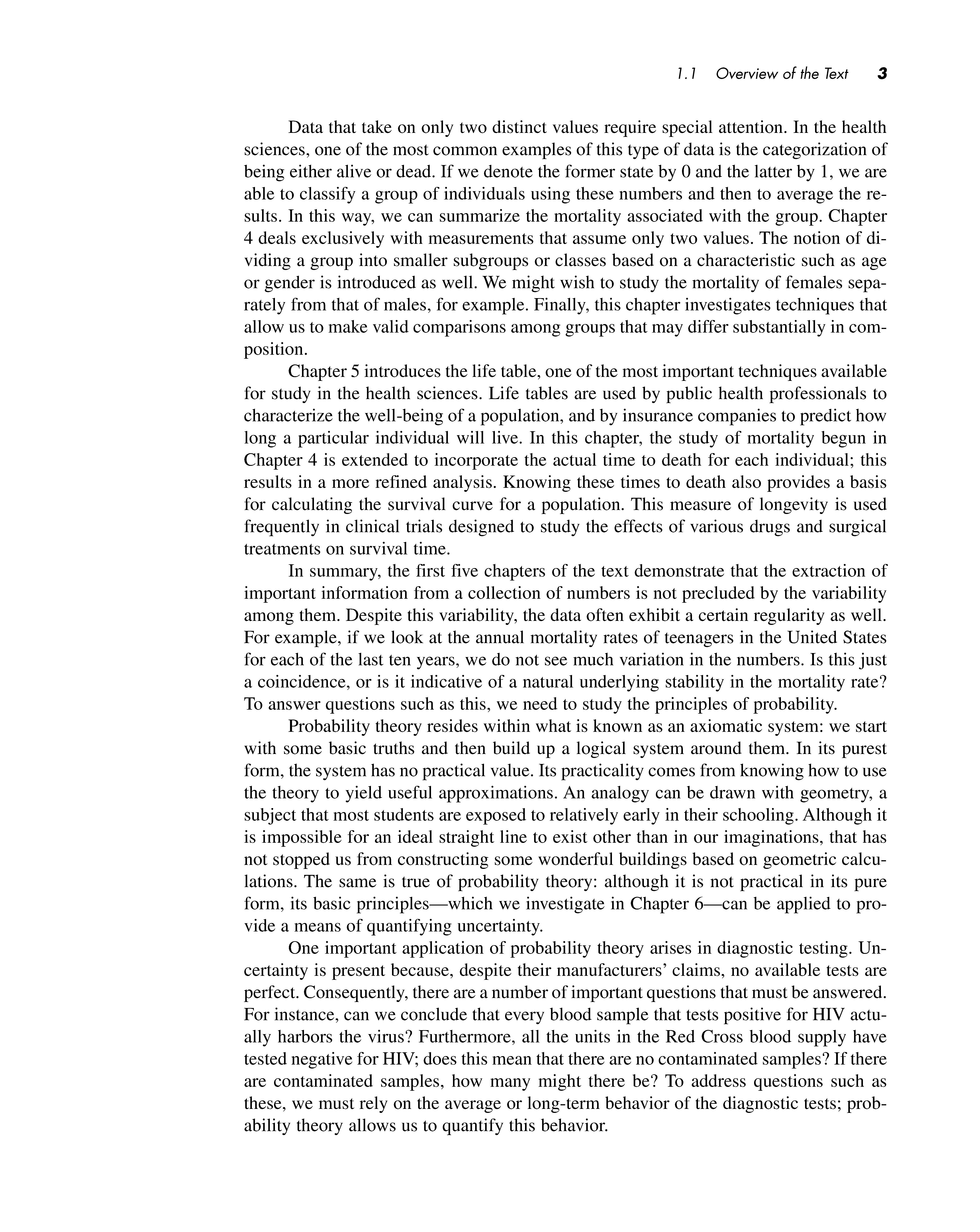 Data that take on only two distinct values require special attention. In the health sciences, one of the most common examples of this type of data is the categorization of being either alive or dead. If we denote the former state by 0 and the latter by 1, we are able to classify a group of individuals using these numbers and then to average the results. In this way, we can summarize the mortality associated with the group. Chapter 4 deals exclusively with measurements that assume only two values. The notion of dividing a group into smaller subgroups or classes based on a characteristic such as age or gender is introduced as well. We might wish to study the mortality of females separately from that of males, for example. Finally, this chapter investigates techniques that allow us to make valid comparisons among groups that may differ substantially in composition.