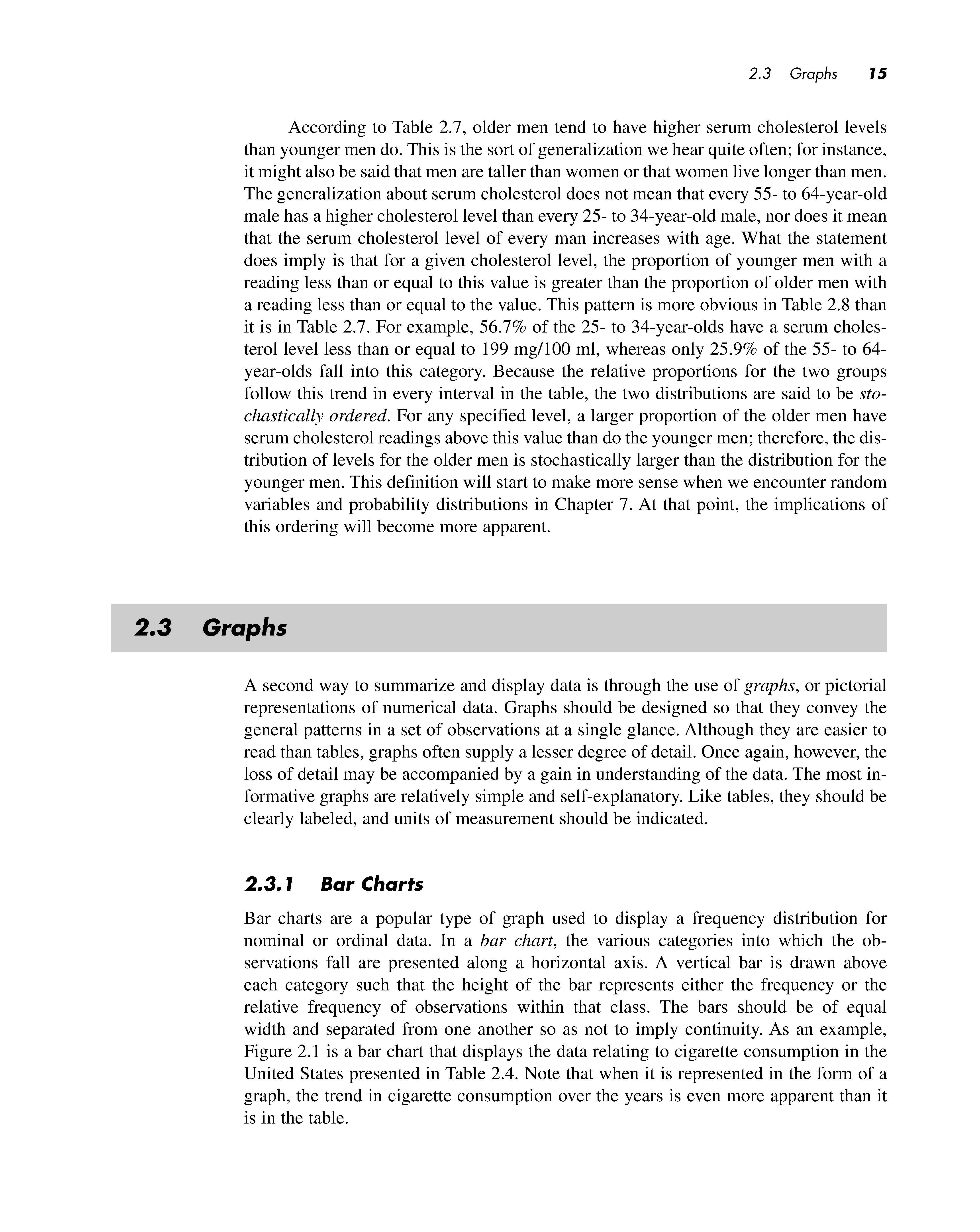 According to Table 2.7 , older men tend to have higher serum cholesterol levels than younger men do. This is the sort of generalization we hear quite often; for instance, it might also be said that men are taller than women or that women live longer than men. The generalization about serum cholesterol does not mean that every 55- to 64-year-old male has a higher cholesterol level than every 25- to 34-year-old male, nor does it mean that the serum cholesterol level of every man increases with age . What the statement does imply is that for a given cholesterol level, the proportion of younger men with a reading less than or equal to this value is greater than the proportion of older men with a reading less than or equal to the value . This pattern is more obvious in Table 2.8 than it is in Table 2.7. For example , 56.7 % of the 25- to 34-year-olds have a serum cholesterol level less than or equal to 199 mg/100 ml , whereas only 25.9 % of the 55- to 64year-olds fall into this category. Because the relative proportions for the two groups follow this trend in every interval in the table, the two distributions are said to be stochastically ordered . For any specified level , a larger proportion of the older men have serum cholesterol readings above this value than do the younger men; therefore, the distribution of levels for the older men is stochastically larger than the distribution for the younger men. This definition will start to make more sense when we encounter random variables and probability distributions in Chapter 7. At that point , the implications of this ordering will become more apparent.