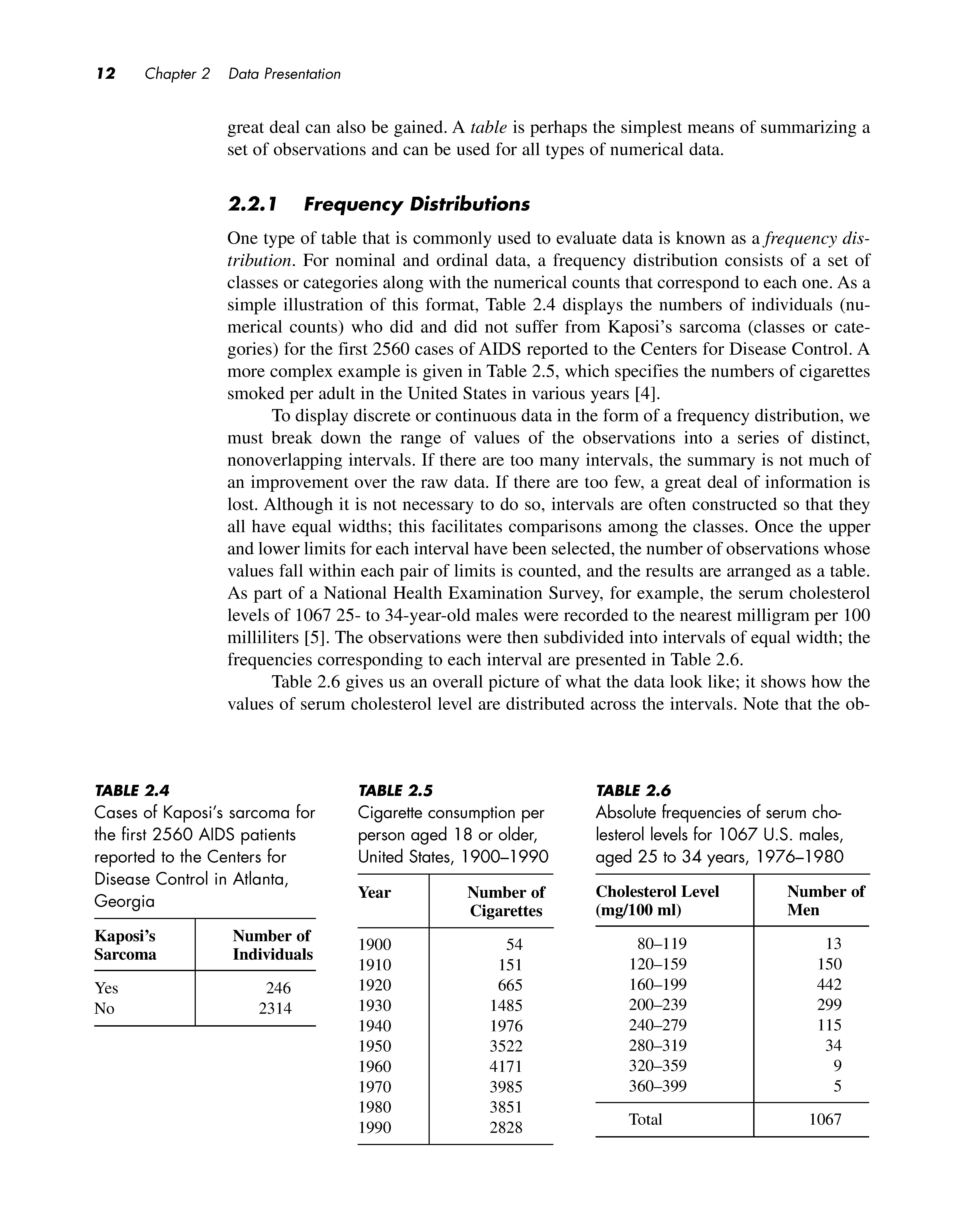 One type of table that is commonly used to evaluate data is known as a frequency distribution. For nominal and ordinal data, a frequency distribution consists of a set of classes or categories along with the numerical counts that correspond to each one. As a simple illustration of this format, Table 2.4 displays the numbers of individuals (numerical counts) who did and did not suffer from Kaposi's sarcoma (classes or categories) for the first 2560 cases of AIDS reported to the Centers for Disease Control. A more complex example is given in Table 2.5, which specifies the numbers of cigarettes smoked per adult in the United States in various years [4].