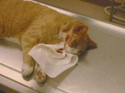 FIGURE 1–1 Draining an abscess on the side of the face of an anesthetized cat.