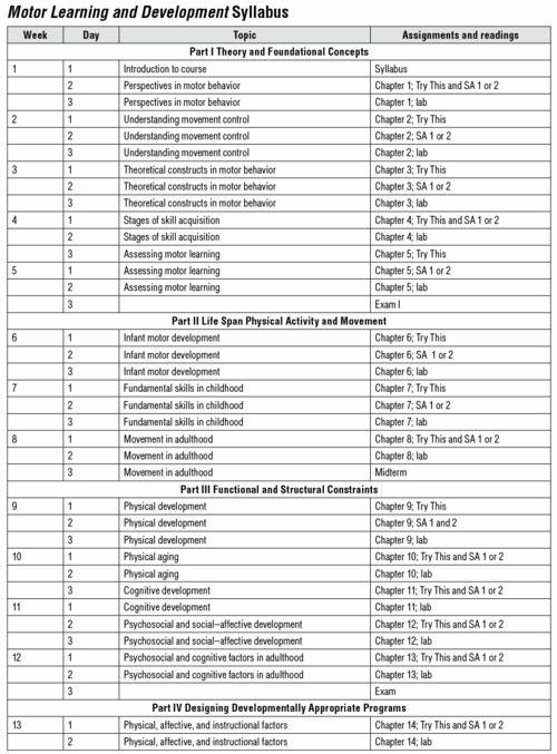 same applies to a course focusing more on adult development and aging. In this case, the emphasis may be on chapters 8, 10, and 13 in addition to parts I and IV. As noted in the sample syllabus, the material in Motor Learning and Development, Second Edition, can be taught over the course of a 15-week semester.
