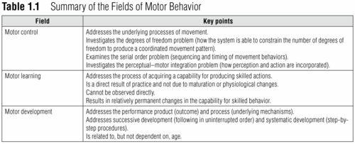 A full understanding of the fields of motor behavior is necessary before designing, implementing, or assessing a motor skill program. Motor behavior is an umbrella term for the fields of motor control, motor learning, and motor development. Motor control researchers investigate the neural, physical, and behavioral aspects of human movement An understanding of all three fields motor learning, motor development, and motor control optimizes skill acquisition. Motor learning is the study of the processes involved in the acquisition of a motor skill and the factors that enhance or inhibit the ability to perform a motor skill. Researchers in the field of motor development examine the products and underlying processes of motor behavior changes across the life span (See table 1 1 for a summary of each field.)