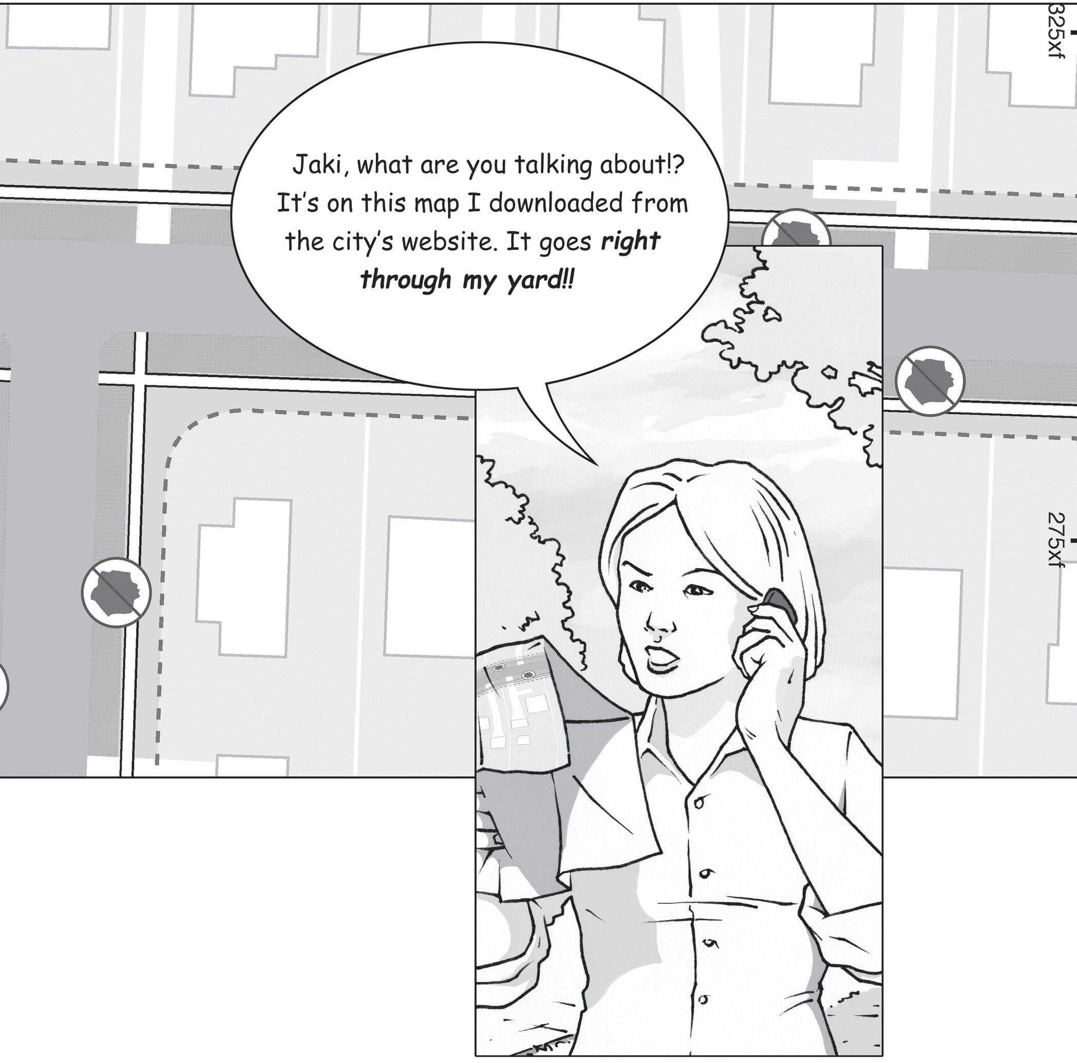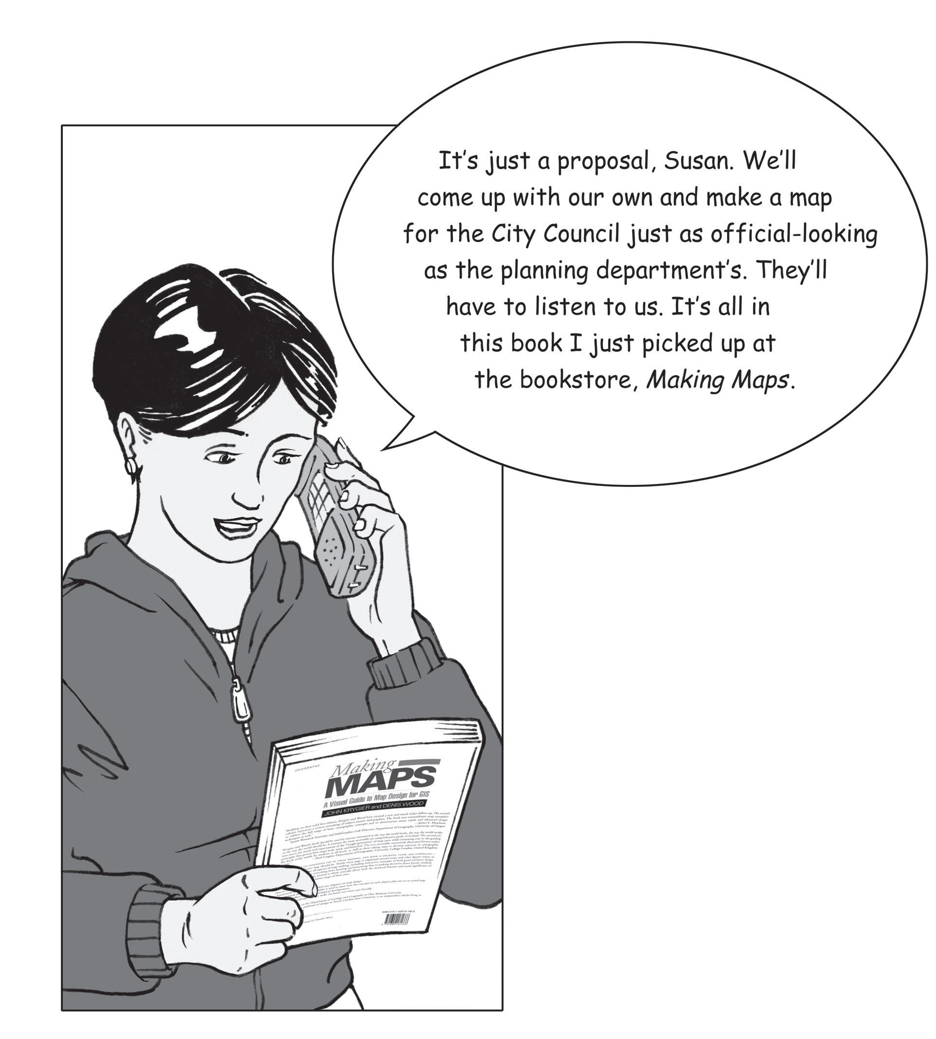 People communicate about their places with maps. Less common than talk or writing, maps are made when called for by social circumstances. Jaki and Susan are making maps to protect their neighborhood. Why a map? Because the city used a map. The map unambiguously expresses the city’s intentions to widen Crestview Road, drawing from the maps, talk, and text of city planners. If the plan is realized, the city will also use maps to communicate its intentions to surveyors, engineers, contractors, utility companies, and others.