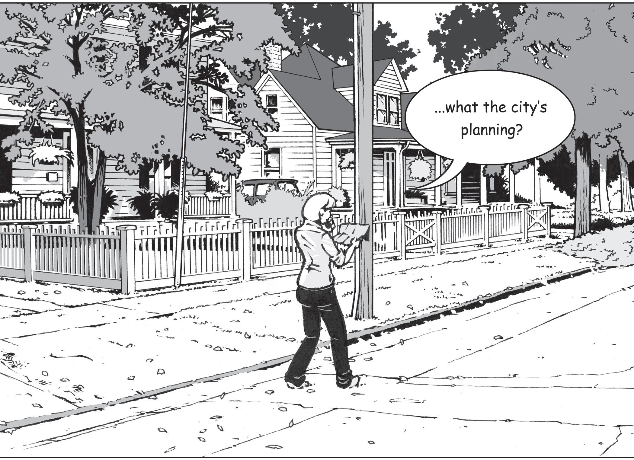 Jaki and Susan soon realize the plan to widen Crestview is but a piece of a larger plan to redevelop the northern and western suburbs of the city. The key feature of the plan is a connector (in solid black, below) proposed to link two major roads. Different groups create equally effective maps to articulate their different perspectives on the proposed road. Though the maps may seem polemical, isolating the facts each presents is useful in focusing debate.