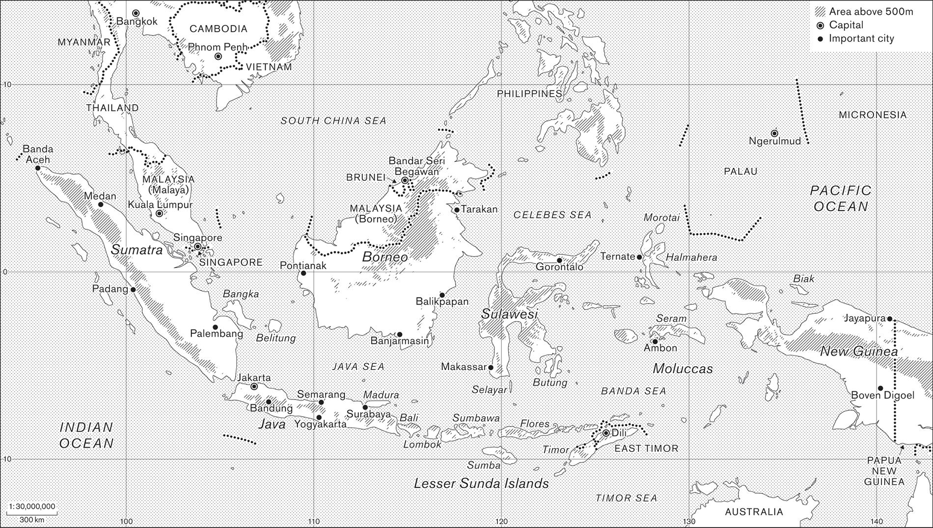 Let’s start with a quick glance at the world map. Indonesia’s place on the margins of that map reflects its marginal role in our image of the world: that mess on the lower right, that splatter of islands between the Pacific and Indian Oceans, apparently that’s it. It’s far away from compact Western Europe and massive North America, which are at the top – a historical convention, of course, since the surface of the earth has no centre and the cosmos no up or down. But if you shift the perspective and put Indonesia in the centre, you realise this is not some dusty corner of the world, but a strategically located archipelago in a vast maritime region between India and China. For seafarers in ages past, the islands made perfect stepping stones between East and West: a double row, mostly growing smaller further to the east. The Malay Peninsula practically rubs shoulders with colossal Sumatra in the southern row, and then there are Java, Bali, Lombok, Sumbawa, Flores and so on. The northern row consists of Borneo, Sulawesi and the Moluccas, which are massive, spindly and fragmented, respectively. The two strings of beads converge at New Guinea. Indonesia is the world’s largest island realm. Officially, it is made up of 13,466 islands, but it could also be 16,056. Or 18,023. No one knows exactly. Volcanoes, earthquakes and tides are constantly transforming the coastlines, and when the waters rise the number of islands increases. Once I witnessed it myself: the middle of a tropical island disappeared for six hours at high tide. Were those two islands or one? Two, by the UN definition, but the locals had only one name for the place. Of those countless islands, only a few thousand are inhabited. Although most are tiny, Indonesia includes five of the world’s thirteen largest islands: New Guinea, Borneo, Sumatra, Sulawesi and Java. The first two are shared with Papua New Guinea, Malaysia and Brunei; the last is the most populous island on earth. Java is about 1,000 kilometres long and 100 to 200 kilometres wide, only seven per cent of Indonesia’s total land area, but its 141 million inhabitants make up more than half the population. No wonder so many historic changes began there. But Indonesia is more than Java. The