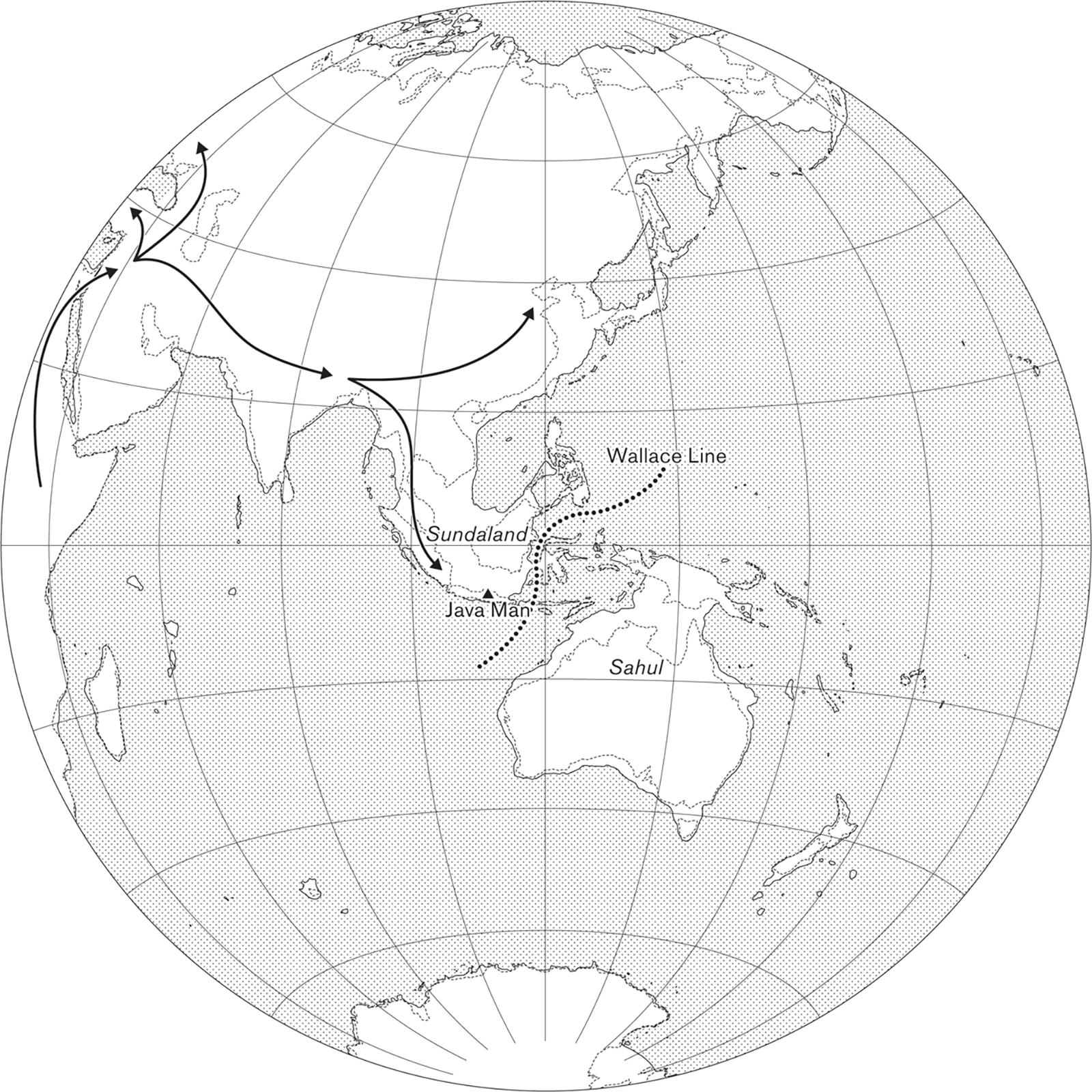 But the oldest Indonesian I met didn’t come to my attention through a dating app. It was during a lunch break in Leiden, back when I was doing doctoral research. I cycled from the archaeology faculty to the natural history museum, where I admired his powerful jaw, robust constitution and handsome features. The palaeontology curator took the remains from a safe and laid them in front of me on a felt cloth. There they were, a molar, a femur and the top of the skull of Java Man, the first Homo erectus ever excavated. The Dutch physician and naturalist Eugène Dubois discovered him in Java in 1891. This was the find that confirmed Darwin’s theory, the first true link between humans and other animals.8 These days, he is thought to be one million years old. Homo erectus migrated from Africa to Java, which was not yet an island, but attached to Sumatra, Borneo, Bali and the Asian mainland. That’s why elephants, tigers, orangutans and other mainland species can still be found there. The islands further east have a different, more ‘Australian’ fauna: echidnas, wallabies, quolls and other marsupials. A biological dividing line runs across the archipelago: the Wallace Line, named after Alfred Russel Wallace, the brilliant but often overshadowed co-creator of the theory of evolution. One million years –that’s a long time ago. Homo erectus did not arrive in Europe until half a million years later, and it was not until about 12,000 years ago that both the Americas had human inhabitants. Unlike these far corners of the globe, Indonesia was part of the first wave of expansion by the world’s first human inhabitants. Perhaps human evolution was also a kind of Asian–African Conference.
