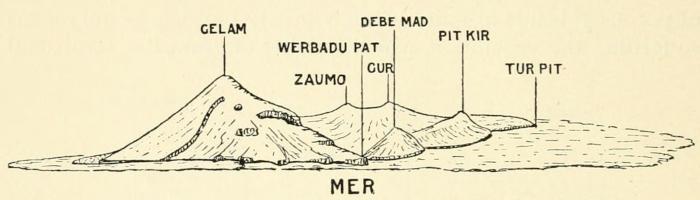 Strictly speaking, to the three islands of Mer, Dauar, and Waier should the name of Murray Islands, or Murray’s Islands, be confined; but in Torres Straits the name of Murray Island has become so firmly established for the largest of them that, contrary to my usual custom, I propose to adopt the popular rather than the native name. Mer, or Murray Island, is only about five miles in circumference, and is roughly oval in outline with its long axis running roughly north-east to south-west. The southerly half consists of an extinct crater, or caldera, which is breached to the north-east by the lava stream that forms the remainder of the high part of the island. This portion is very fertile, and supports a luxuriant vegetation, which, when left to itself, forms an almost impenetrable jungle; it is here that the natives have the bulk of their gardens, and every portion of it is or has been under cultivation. The great crescentic caldera valley, being formed of porous volcanic ash and being somewhat arid, is by no means so fertile; the vegetation, which consists of grass, low scrub, and scattered coconut palms, presents a marked contrast to that of the rest of the island. The slopes of the hills are usually simply grass-covered.