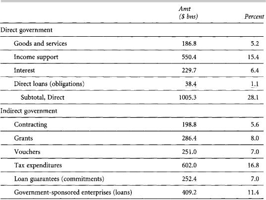 More generally, as re ected in Table 1-3, the direct provision of goods or services by government bureaucrats accounts for only 5 percent of the activity of the U.S. federal government. Even with income transfers, direct loans, and interest payments counted as “direct government,” the direct activities of the federal government amount to only 28 percent of its activities. Far larger in scale are other instruments of public action—contracting, grants-in-aid, vouchers, tax expenditures, loan guarantees, government-sponsored enterprises, insurance, and regulation, to name just a few. Including just the $376 billion in net additions to outstanding deposit insurance in 1999 and not the far larger amounts of pension, crop, and disaster insurance, a rough estimate would put the total monetary value of these activities in the neighborhood of $2.5 trillion as of scal year 1999, two and a half times higher than the roughly $1 trillion in direct activities in which the federal