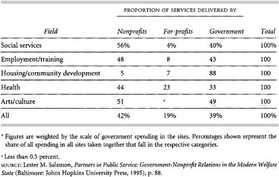 Re ecting this, a study of a cross section of U.S. communities carried out by the present author in the early 1980s found that the majority of the government- nanced human services available at the local level was already being delivered by private nonpro t and for-pro t organizations as of that date, and this was well before the advocates of “privatization,” contracting out,” and “reinventing government” had proposed it. In particular, as shown in Table 1-1, government agencies delivered only 40 percent of these publicly funded services, while private agencies—both nonpro t and forpro t—delivered 60 percent.10