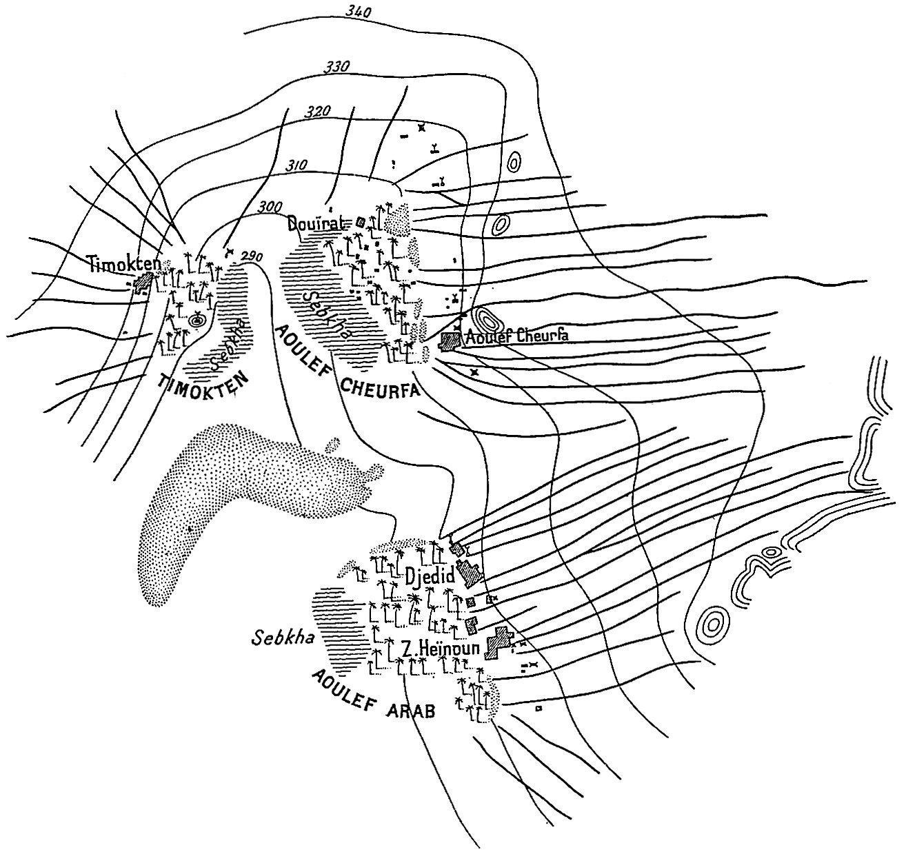 Le Tidikelt a donc une hydrographie assez originale. D’autre part on sait déjà qu’il partage avec le bas Touat le privilège regrettable d’être ensablé. In Salah est très menacé par les dunes. Aoulef l’est aussi comme en témoigne la carte. D’après les traditions, dans un certain nombre de ksars l’homme a été chassé par le sable.