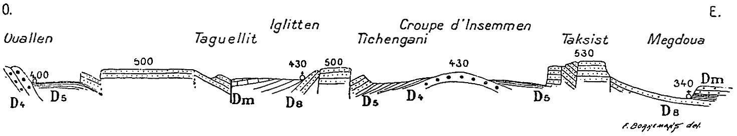 Sur la limite supérieure de l’Éodévonien s’alignent Afoud Dag Rali, H. Bel Rezaim, H. In Belrem, Taguerguera, Tikedembati, Taloak, Tin Taggar, Tezzaï, Meghdoua, Tikeidi, Iglitten, Taguellit.