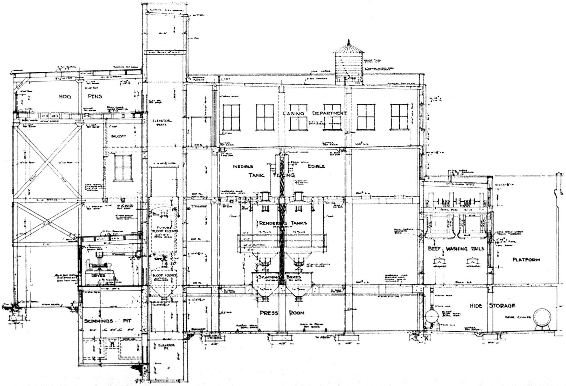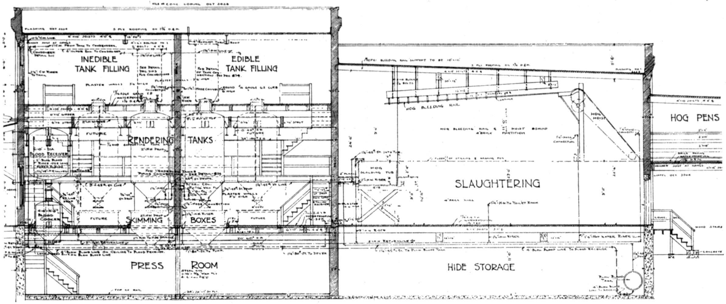—Attention is called to the fact that in the rendering department, for example, the products in their steps of manufacture are handled by gravity entirely until the finished dried fertilizer is produced, which has to be elevated to the ground level for car shipment, or for wagon delivery. The same features are true of the abattoir, hides and tallow in casks only, requiring the use of elevators for shipment.