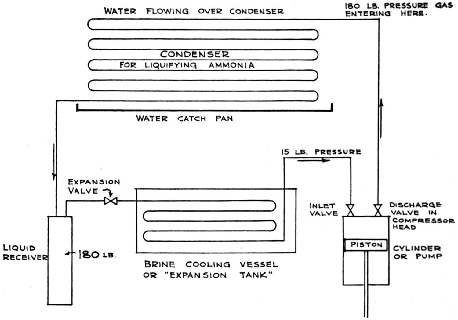 The diagram illustrates a single acting pump showing its piston, a liquifier or condenser where the ammonia is modified in form from a gas as received therein to a liquid; a receiver to which it flows and a cooler in which it is expanded and where the heat brought to it by the returning brine is picked up by the ammonia and carried to the condenser. The arrows indicate the direction of flow.