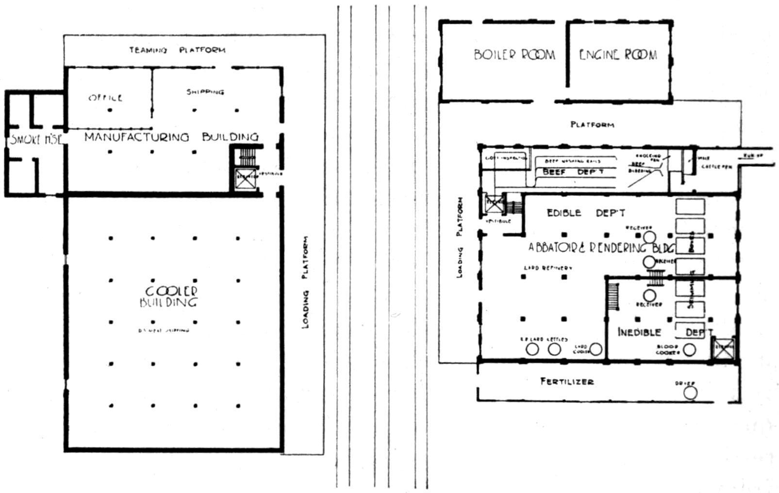 —The abattoir is made the center of distribution, with the refrigerated buildings and departments directly communicative, situated nearby. The rendering and manufacturing departments—users of steam and power—are grouped near to the abattoir and to the power plant, while the buildings requiring refrigeration are grouped together and isolated from the manufacturing buildings. The stock pens connected with the plant